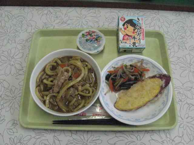 【今日のメニュー】 カレーうどん、さつまいもの天ぷら、もやしと小松菜のからしじょうゆ、フルーツミックスゼリー、牛乳 【栄養教諭より】 今日から2学期の給食がスタートしました。運動会に向けて練習も始まりますので、今月は栄養だけでなく、配膳の手間等も考え、子どもたちの食べやすい献立を多くしました。 初日は、みんなの大好きなカレーうどんとさつまいもの天ぷらです。かつお節でしっかり出汁をとって作っています。