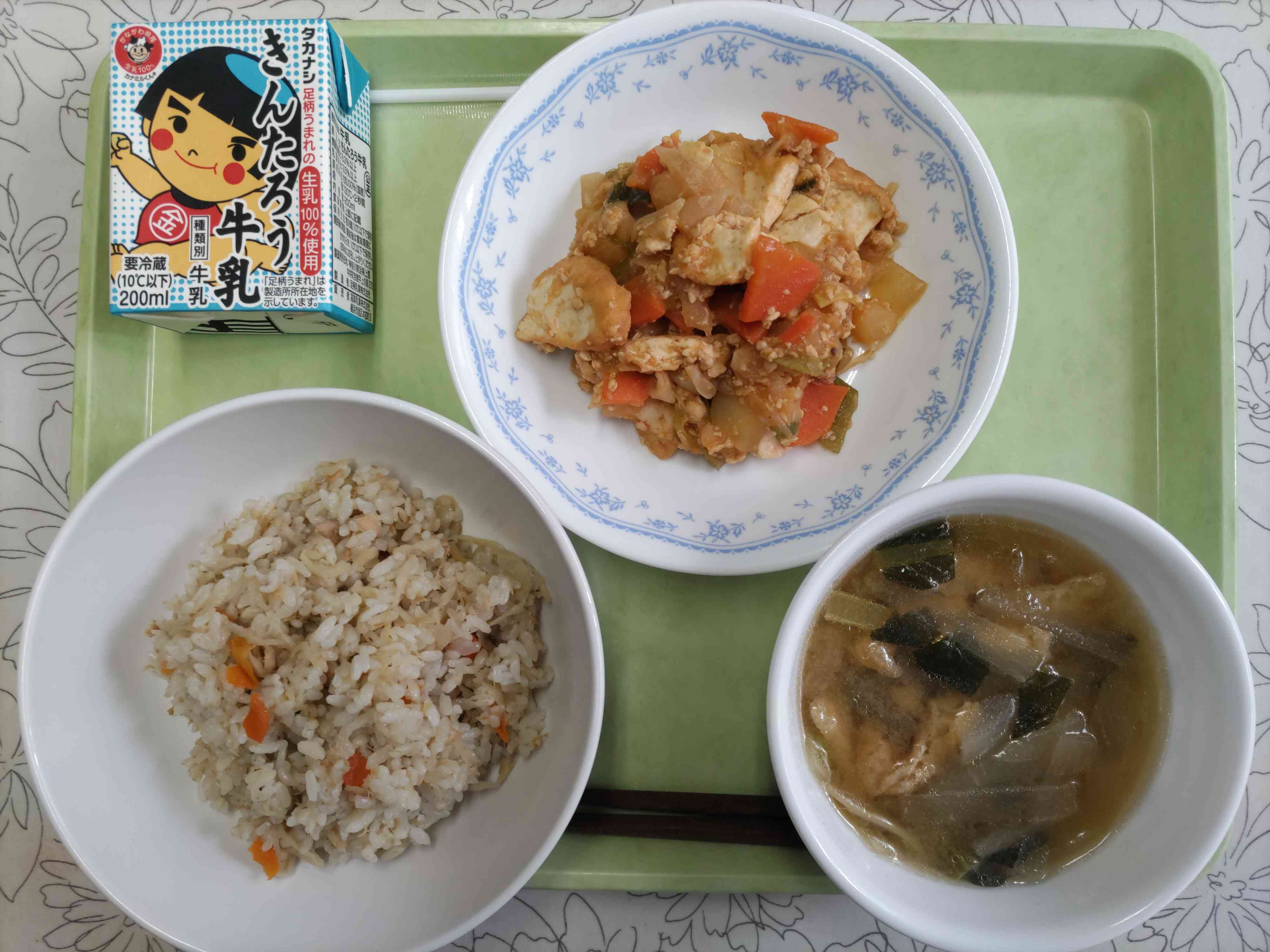【今日の献立】 ツナのたきこみご飯 大根のみそ汁 生揚げの四川煮 【栄養教諭から】 今日は生揚げをピリ辛の四川風の味に煮ました。ひき肉も入ってそぼろあんになっています。今日は生揚げ、みそ汁には油揚げ、そしてご飯には切干大根が入っていてカルシウム満点の献立です。寒いと牛乳の残しが増えがちなので食材からもしっかりととってほしいです。