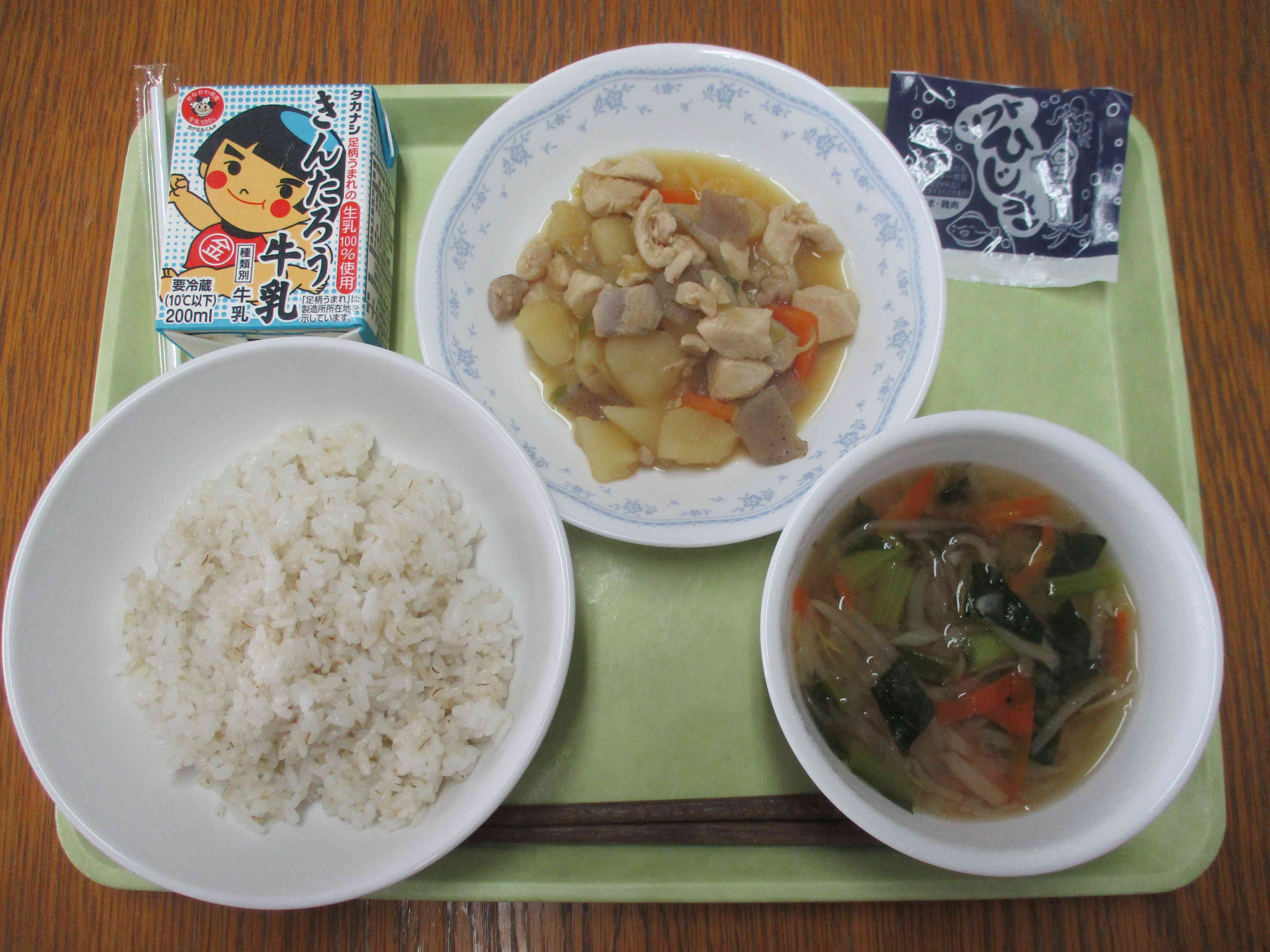 【今日の献立】 麦ごはん ソフトひじき 牛乳 切り干し大根のみそ汁 鶏とじゃがいもの甘辛煮 【栄養教諭から】 今日は、切り干し大根をお味噌汁の具として使いました。大根とは違う旨味のつまった味わいです。また、煮ても歯ごたえが残るので、食べごたえがあります。乾物は、使うのが面倒だと思いがちですが、案外と簡単にもどせますので、家で常備しておくと便利です。