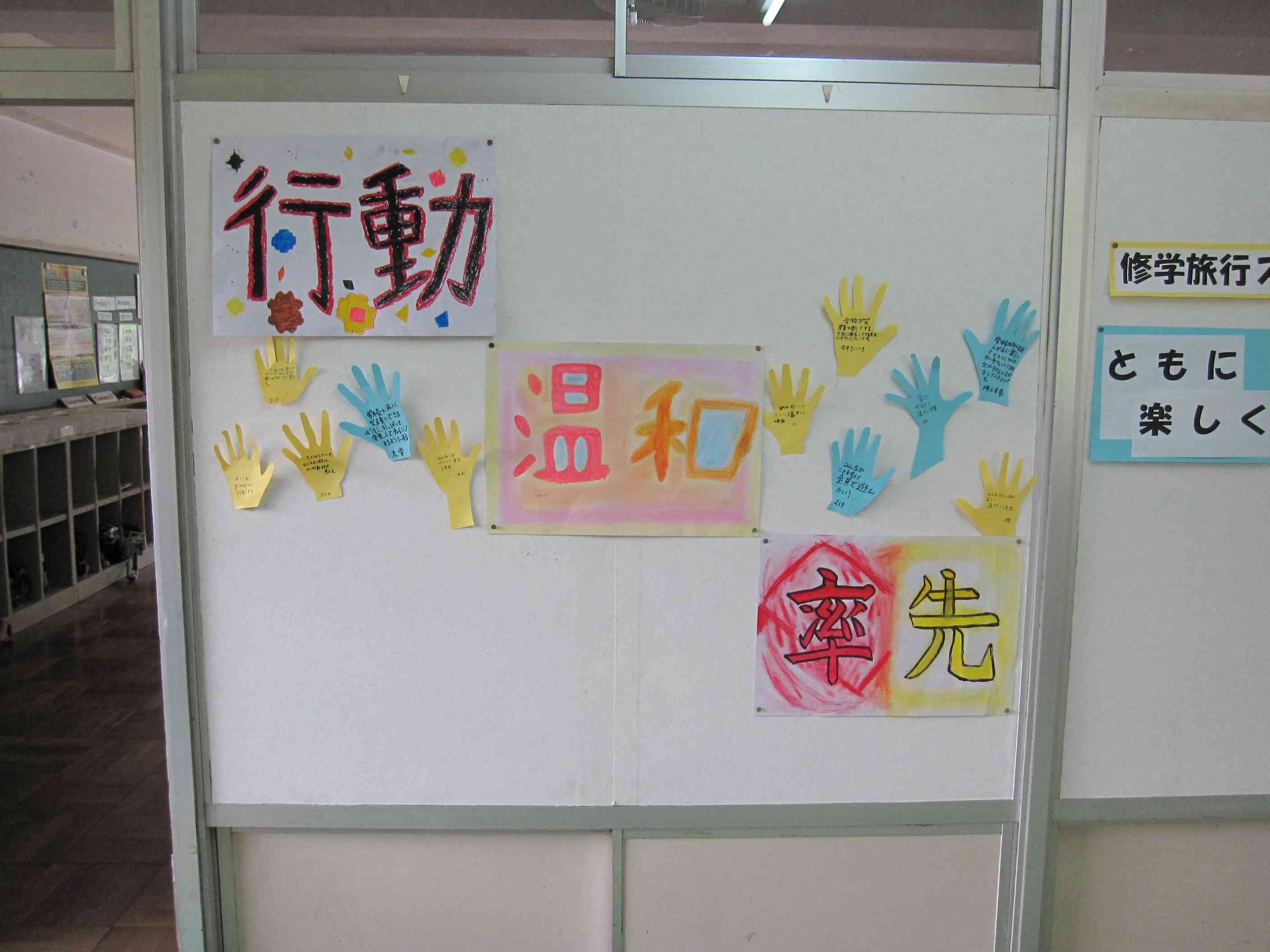 今回は5月17、18日に日光修学旅行を控えている6年生の紹介です。 廊下には学級目標「行動・温和・率先」が掲示してあります。周りの手形には、写真のように個々の学級目標に対する具体的な取組が書かれています。 そして、修学旅行のスローガンは「ともに楽しく」に決まったようです。学級目標同様に、このスローガン達成に向けての個々の具体的な取組も掲示されていました。 今日はパソコン室で修学旅行で訪れる名所の事前学習をしていました。このように修学旅行は、当日を迎えるまでの学習やクラスとしての取組が大切になってきます。もちろん振り返りもです。 楽しい思い出をつくるとともに、クラスとしての団結力を高めたり、輪を深めたりして、1年間、学校のリーダーとして活躍することを期待しています。【添付ファイル】