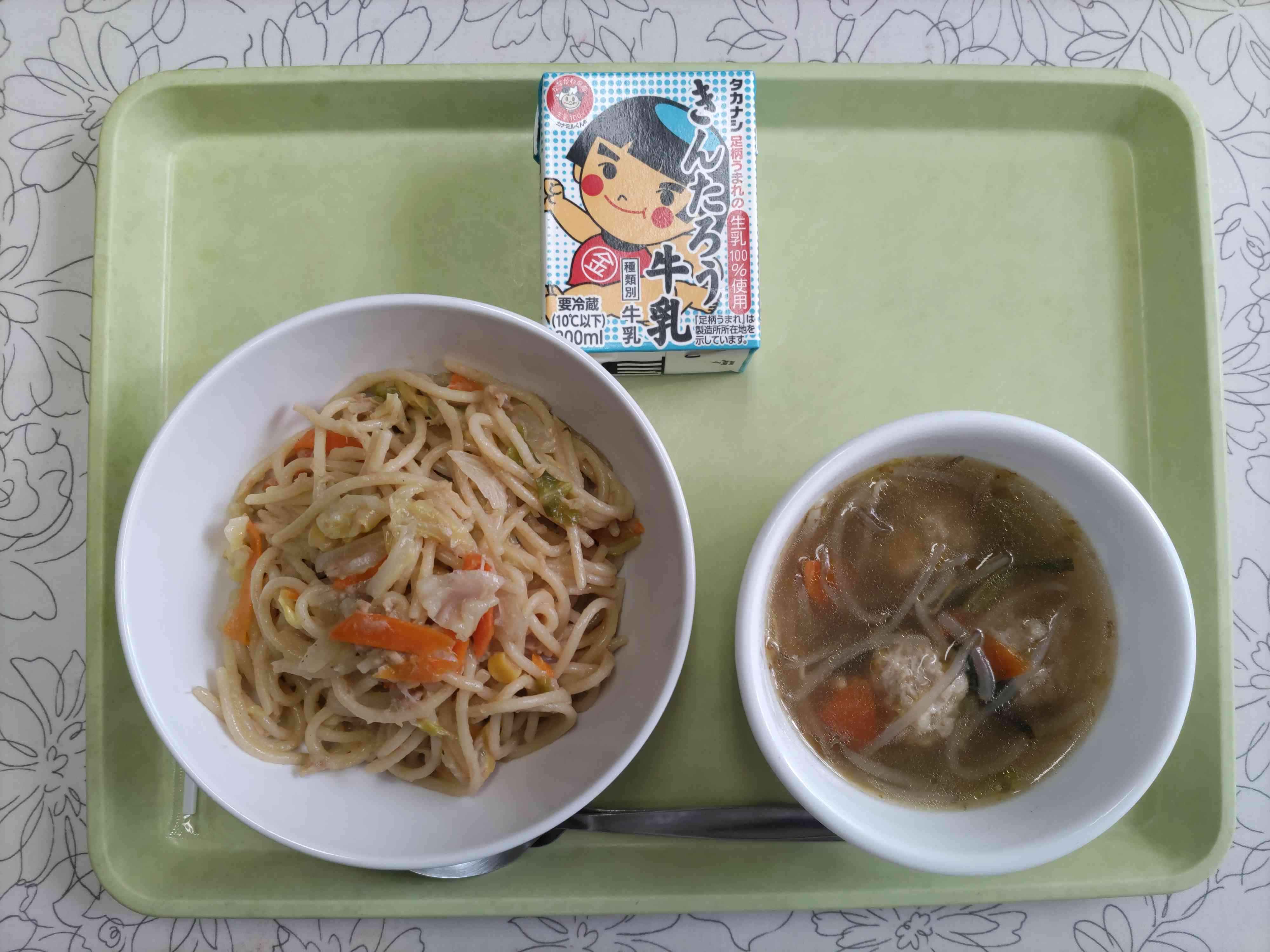 【今日の献立】 春キャベツとツナのパスタ 牛乳 肉団子のスープ 【栄養教諭から】 今日は今が旬の春キャベツをたっぷり使ったスパゲティです。春キャベツは甘味があり、やわらかいのが特徴なので、生で食べるのがおすすめです。給食では加熱しなくてはならないので、後の方に加えておいしさを逃さないように仕上げました。