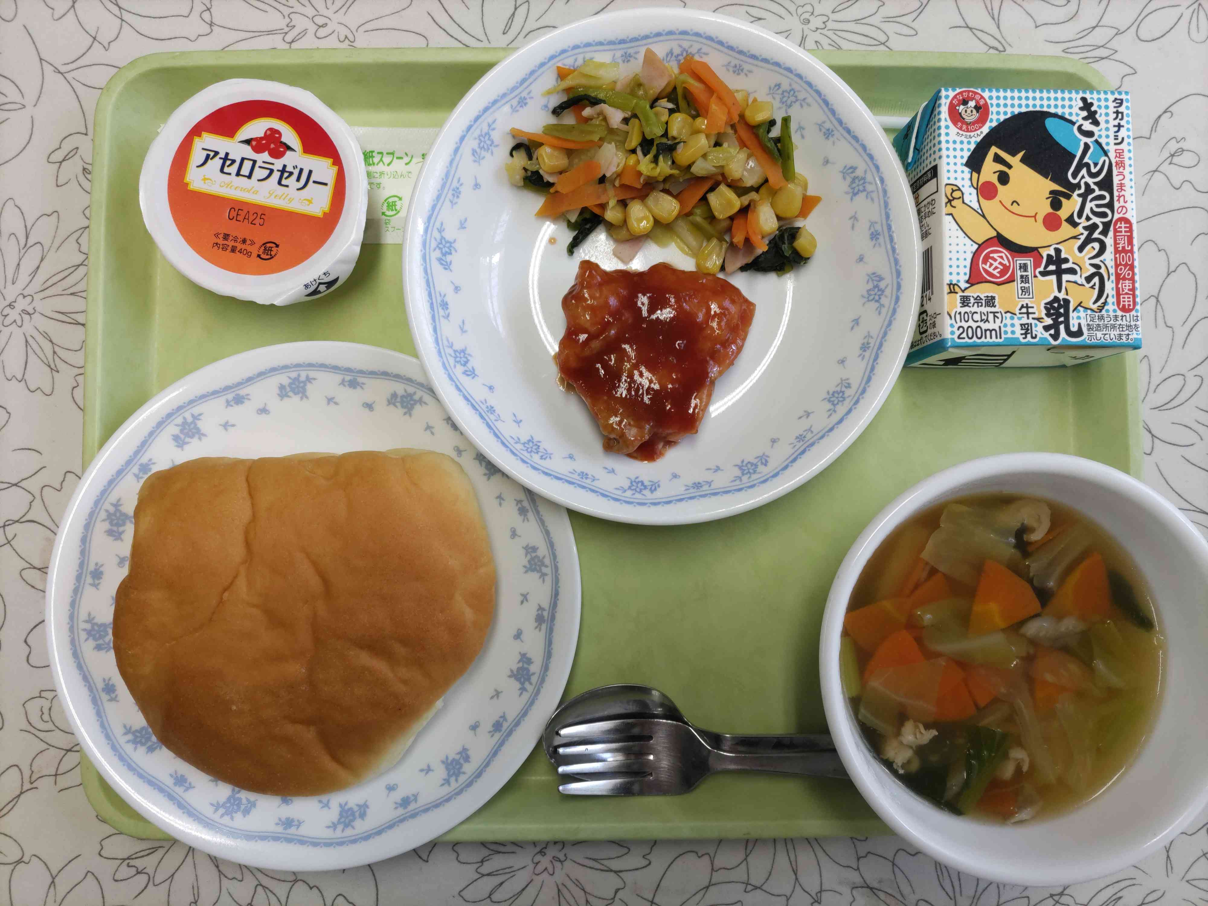 【今日の献立】 サンドパン 牛乳 ABCスープ 鶏肉のケチャップソース 野菜とハムのソテー アセロラゼリー 【栄養教諭から】 今日は昨日とは打って変わって快晴で気持ちのよいお天気です。だんだんと日差しの強い日も増えてきますね。栄養バランスの整った食事は、日差しに負けない肌のためにも大切です。今日はお肌の健康のために大切な栄養素の一つビタミンCをたくさん含むアセロラゼリーを付けました。アセロラの実にはレモン34個分のビタミンCを含みます。体の中から肌を守りながら元気に遊んでほしいですね。【添付ファイル】