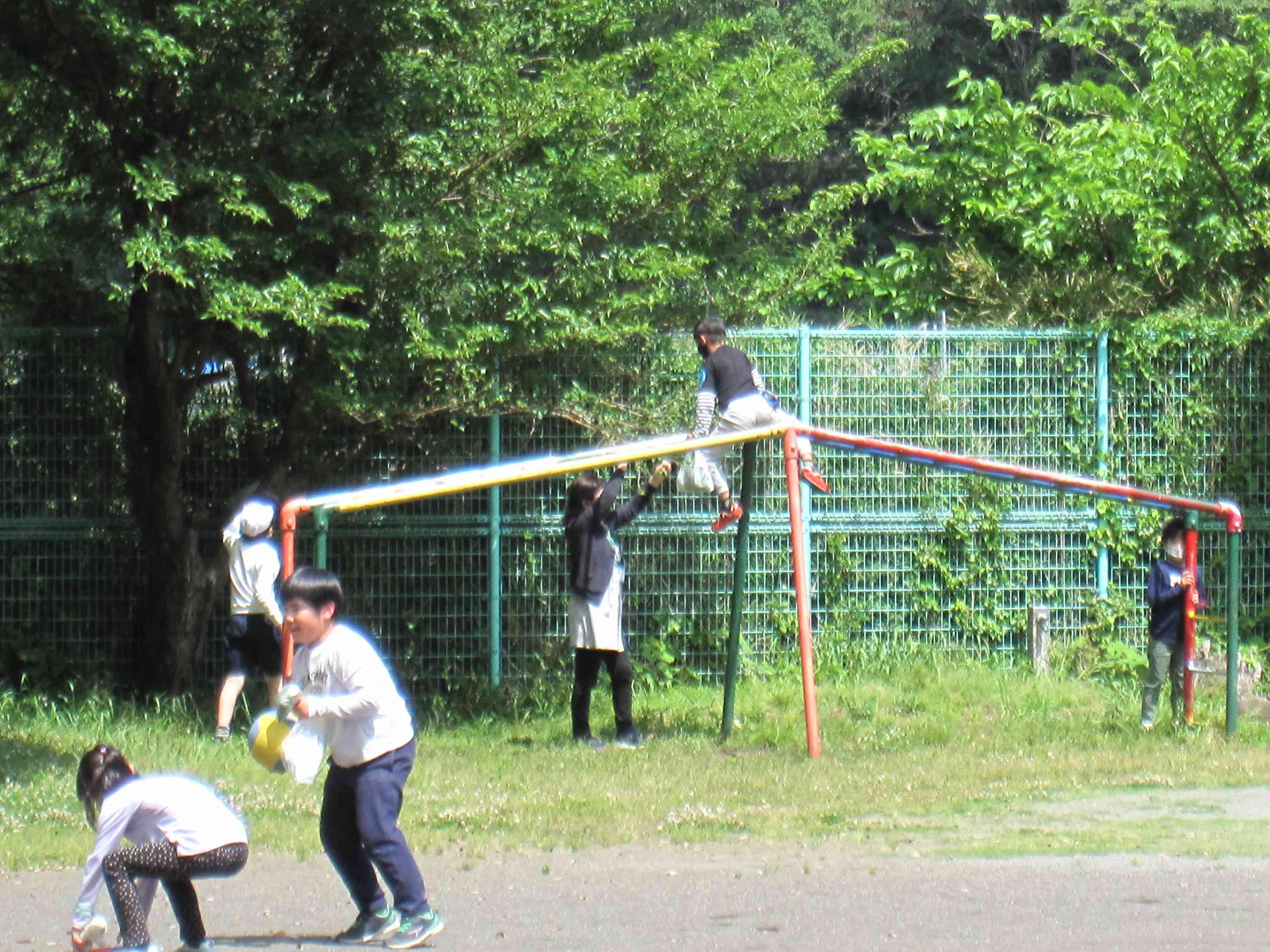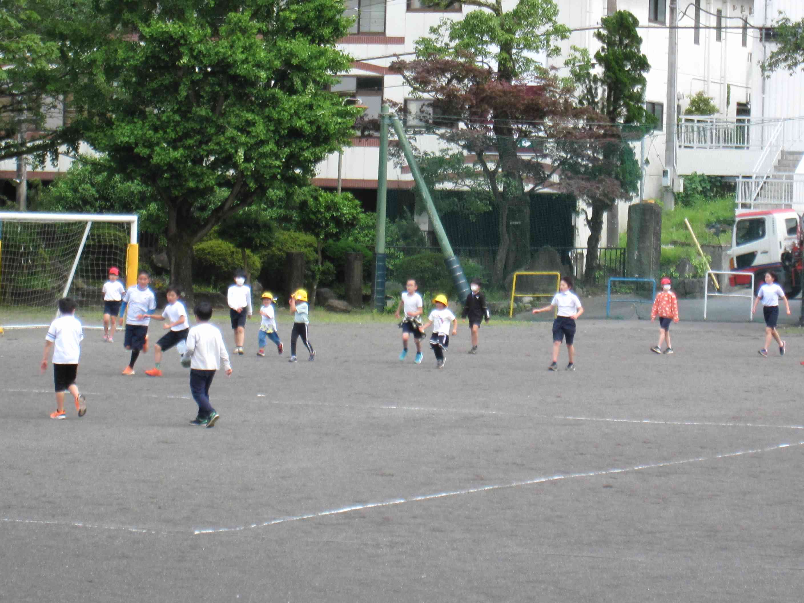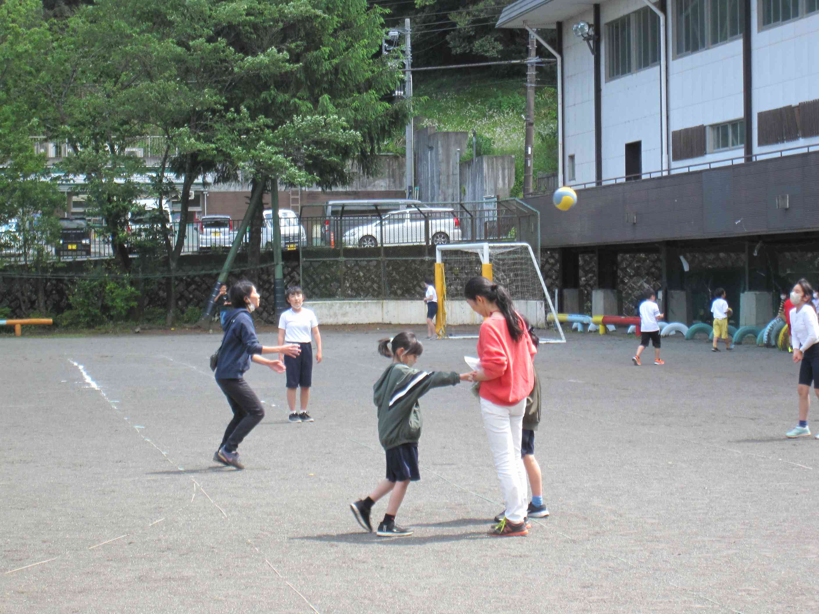 写真は先週5月12日(金)の昼休みの様子です。 1枚目の写真はサッカーをしている子供たちの様子です。よく見ると黄色の校帽をかぶっている子供たちがいます。なんと、上学年の激しいサッカーに1年生も混ざっているのです。小規模校ならではの全校児童が顔見知りというよさがよく出ている光景です。 肝心のサッカーはどうなったかかというと、上学年の子供が1年生に優しくパスをしたところ、1年生は転がってきたボールをしゃがんで手でキャッチするという微笑ましい姿が見られました。その後は、「1年生は危なくないところで見ていてね。」と声を掛けられたそうです。 2枚目以降の写真には教職員が写っています。本校の教職員は時間があるときには写真のように、外に出て子供たちとよく遊んでいます。休み時間は子供たちの心が解放される時間です。授業中とはまた違った子供たちのよさや人間関係が見られる時間でもあります。このように休み時間も子供たちと触れ合うことを通してよりよい学級経営につなげていけたらと考えています。【添付ファイル】