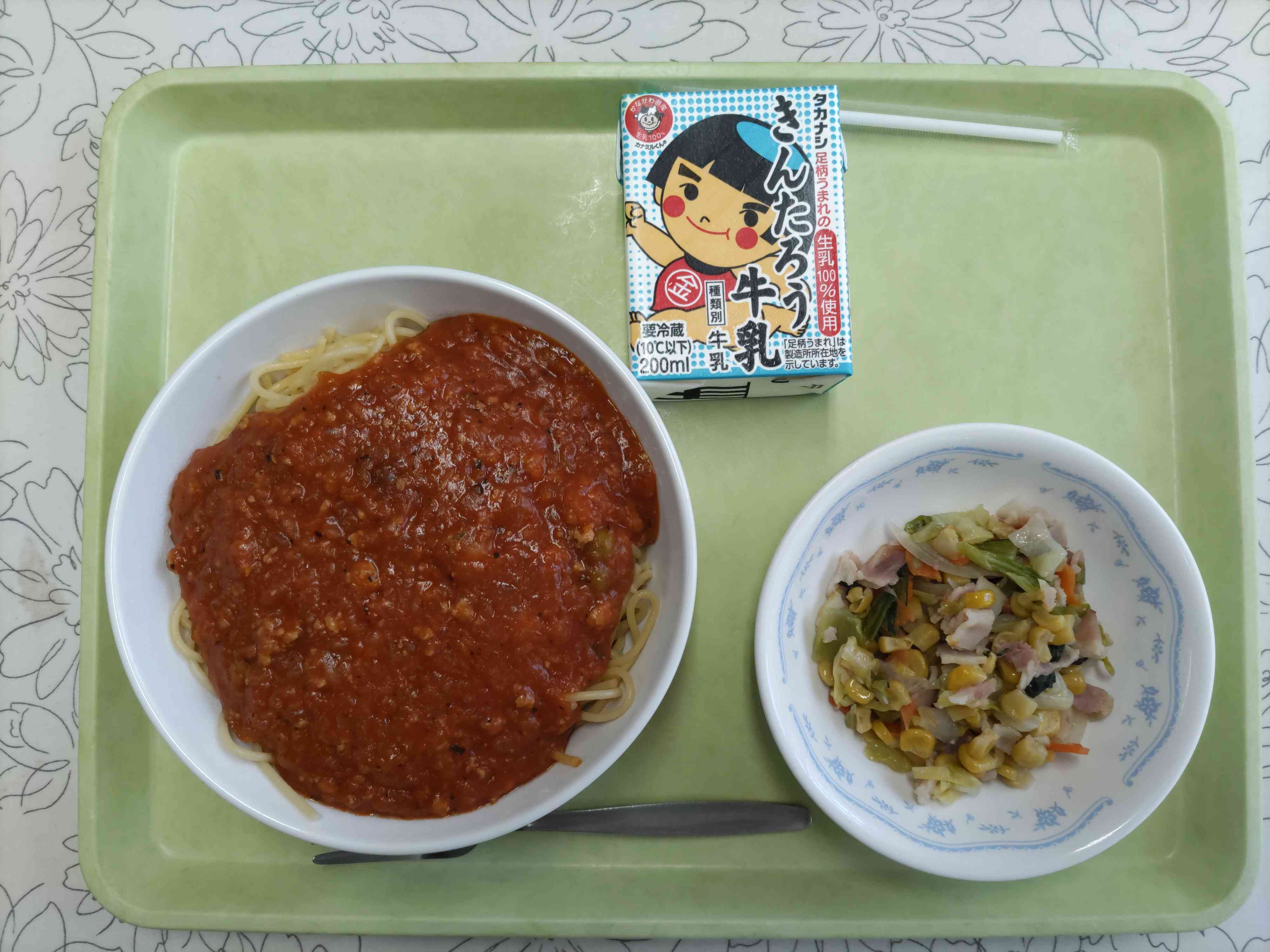 【今日の献立】 スパゲティミートソース 牛乳 野菜とベーコンのソテー 【栄養教諭から】 今日は、子供たちも大好きなスパゲティミートソースです。ミートソースには、セロリがたっぷり入っています。肉と一緒によく炒めると、肉のくさみを消してくれます。今日はバジルも加えました。香りはさわやかですが、ルウやチーズを加えて濃厚な味に仕上げました。