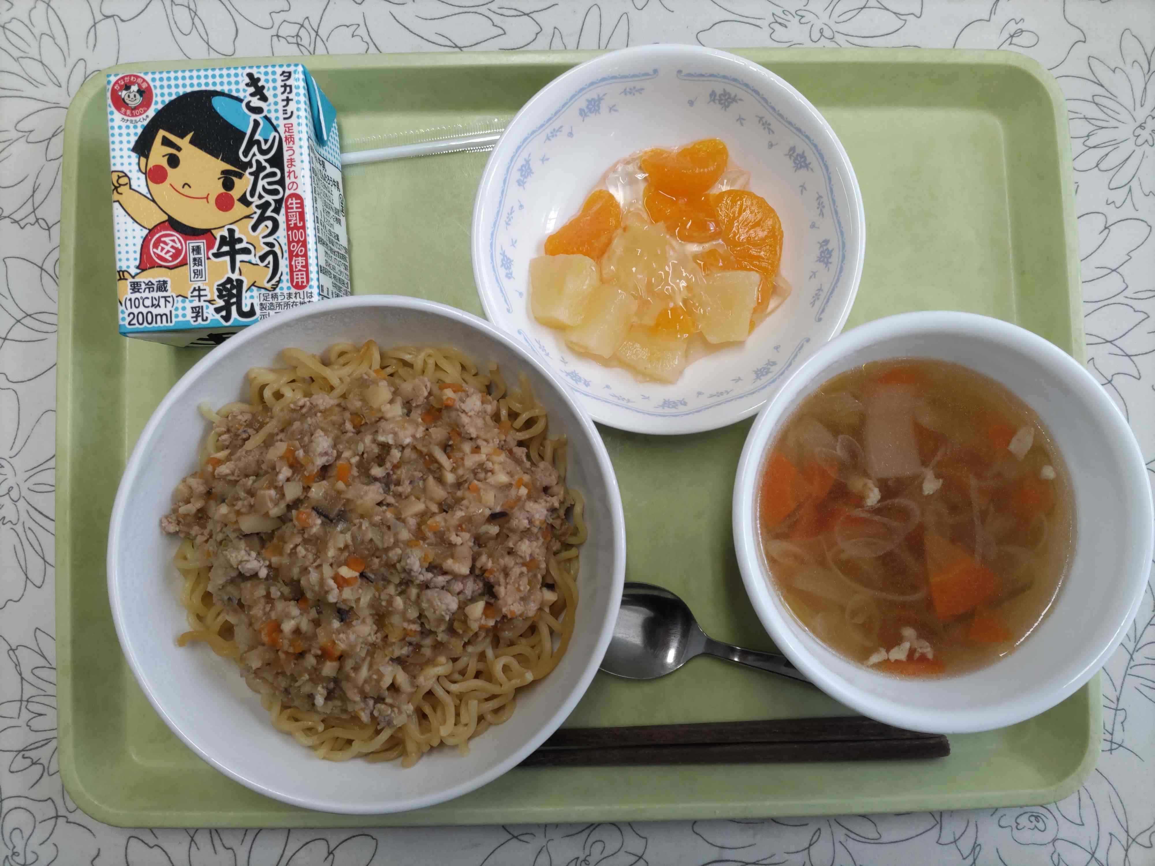 【今日の献立】 ジャージャー麺 牛乳 中華スープ ゼリー入りフルーツミックス 【栄養教諭から】 今日は肉みそをのせたジャージャー麺です。ジャージャン=肉みそです。肉みその中には、人参・玉ねぎ・長ねぎ・干し椎茸・たけのこがみじん切りで入っています。 そして、今日は新デザートです。カットされたゼリーとフルーツ缶を合わせました。ゼリーは桃味です。蒸し暑い今日にさっぱりのゼリー入りフルーツミックスが合うと思います。【添付ファイル】