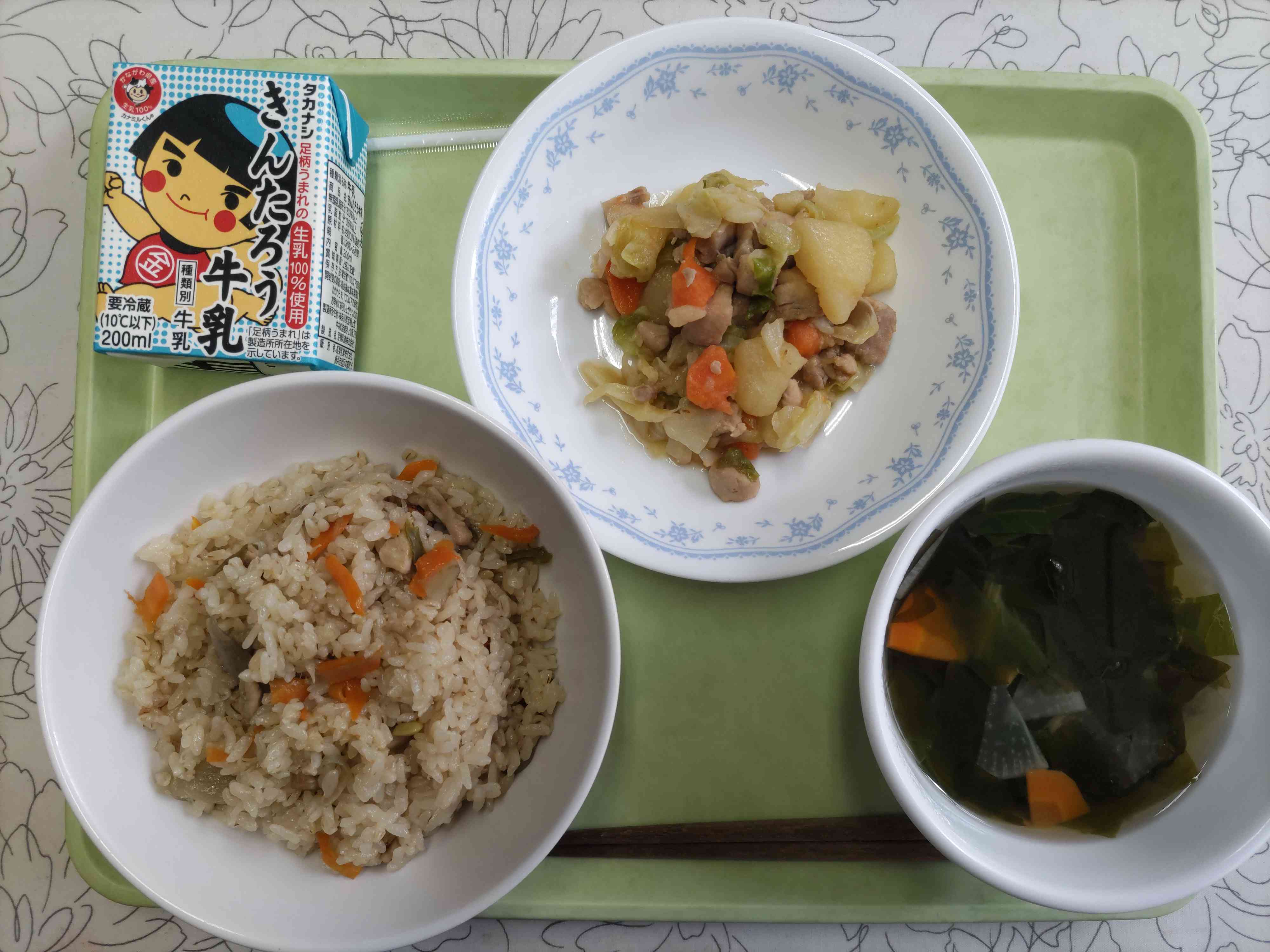 【今日の献立】 鶏ごぼうご飯 牛乳 わかめのすまし汁 鶏と野菜の照り焼き 【栄養教諭から】 初夏は新ごぼうの季節ですね。新ごぼうは、4月~6月頃の早いうちに収穫されるものを言います。別名「夏ごぼう」とも呼ばれ初夏の味として親しまれています。若取りなため、やわらかく香りがよいのが特徴です。軽くゆでてサラダなどで食べるのもおすすめです。今日は炊き込みご飯に入れました。