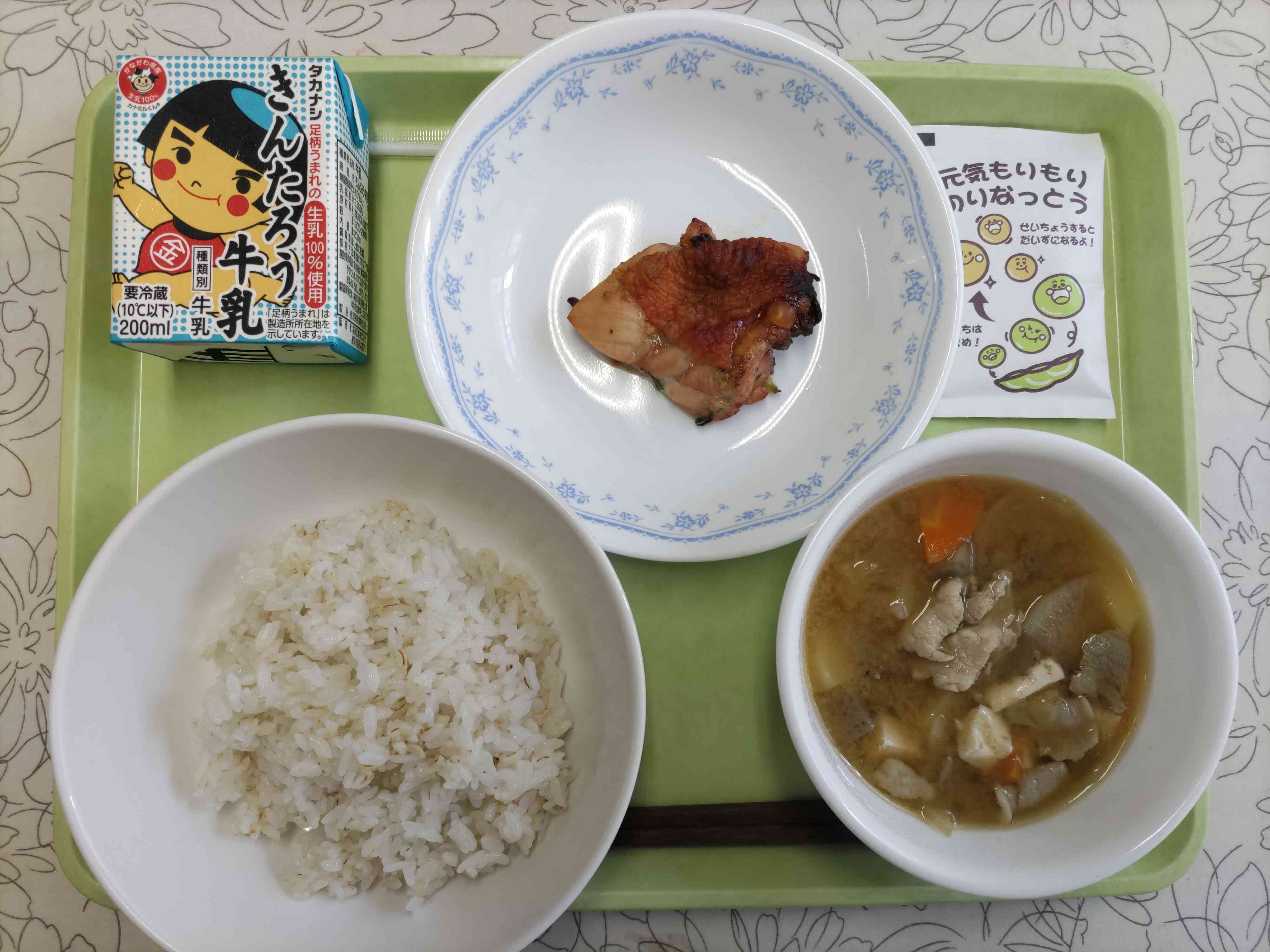 【今日の献立】 麦ごはん 牛乳 納豆ふりかけ 豚汁 鶏の香味焼 【栄養教諭から】 今日は7月10日で納豆の日ということで、納豆ふりかけを付けました。フリーズドライの納豆がふりかけになっていて、温かいご飯に混ぜると粘りけも出てきます。好きな子も多く、人気のふりかけです。