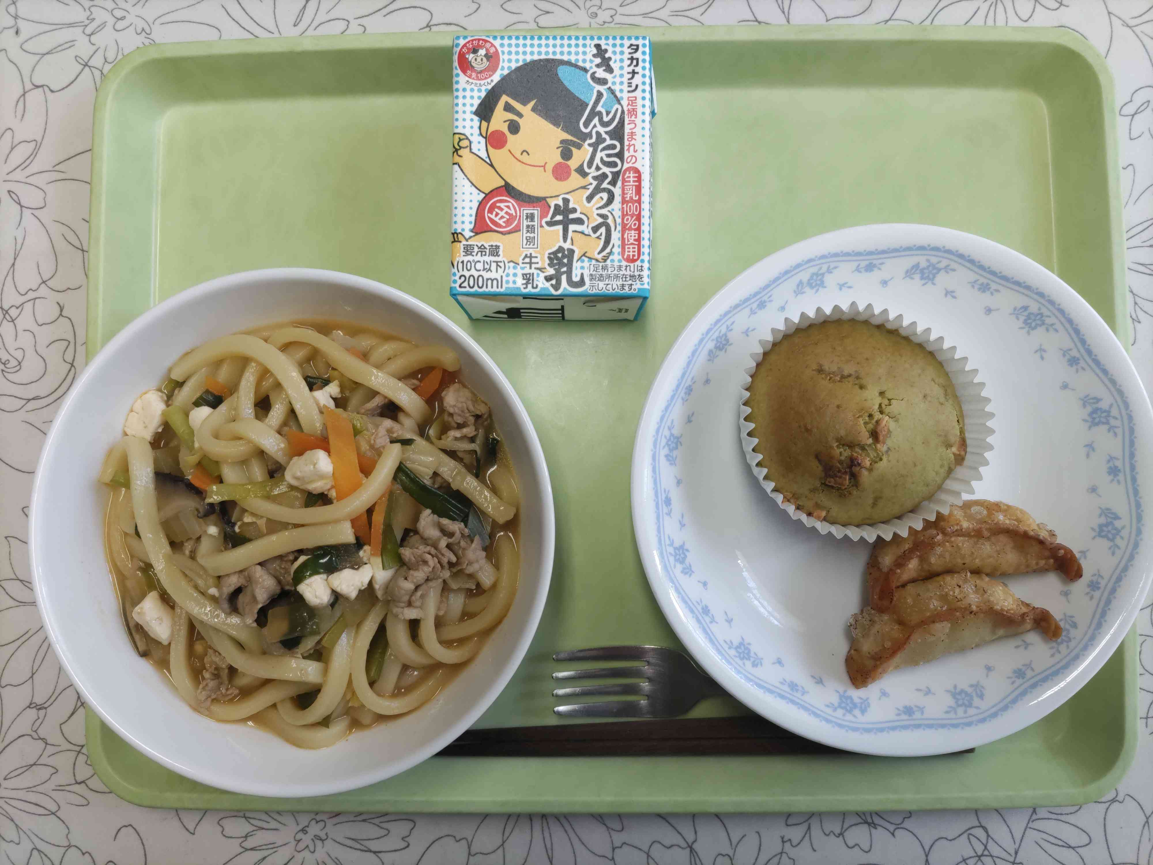 【今日の献立】 チゲうどん 牛乳 お魚くんギョウザ 足柄茶ケーキ 【栄養教諭から】 今日はちょっとピリ辛のチゲうどんです。みそ味ベースで、たっぷりの野菜と豚肉で栄養もうま味もつまっています。足柄茶ケーキは足柄茶の粉末をホットケーキミックスと混ぜて作りました。お茶のほろ苦さと合うホワイトチョコレートを小さくきざんで入れました。