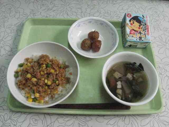【今日のメニュー】 ツナのそぼろ丼、けんちん汁、元気ボールの甘酢あん、牛乳 【栄養教諭から】 けんちん汁は、鎌倉の建長寺が発祥の郷土料理と言われています。精進料理なので、お肉の代わりにお豆腐が入ります。 「元気ボール」は、魚のすり身にじゃこや枝豆、人参などの野菜が入ったさつま揚げです。さっぱりと甘酢あんをからめました。 (*給食では、メニューのネーミングで子どもたちの食欲が増すことも多いので、工夫しています。)【添付ファイル】
