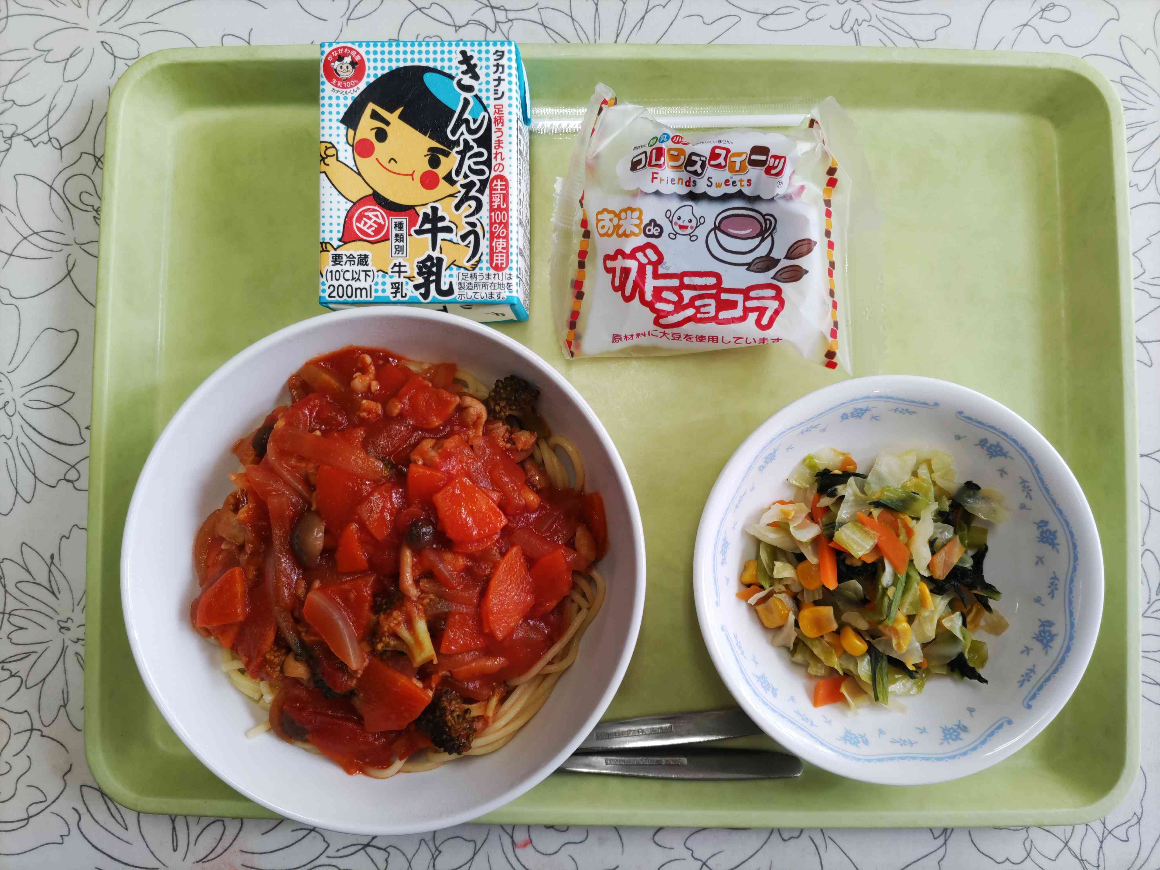 【今日の献立】 スパゲティトマトソース 牛乳 キャベツと青菜の炒め物 お米deガトーショコラ 【栄養士から】 給食初登場の「お米deガトーショコラ」です。小麦粉ではなく、米粉を使用しています。カカオ風味の濃厚な味、しっとりした食感を楽しんで食べてください。