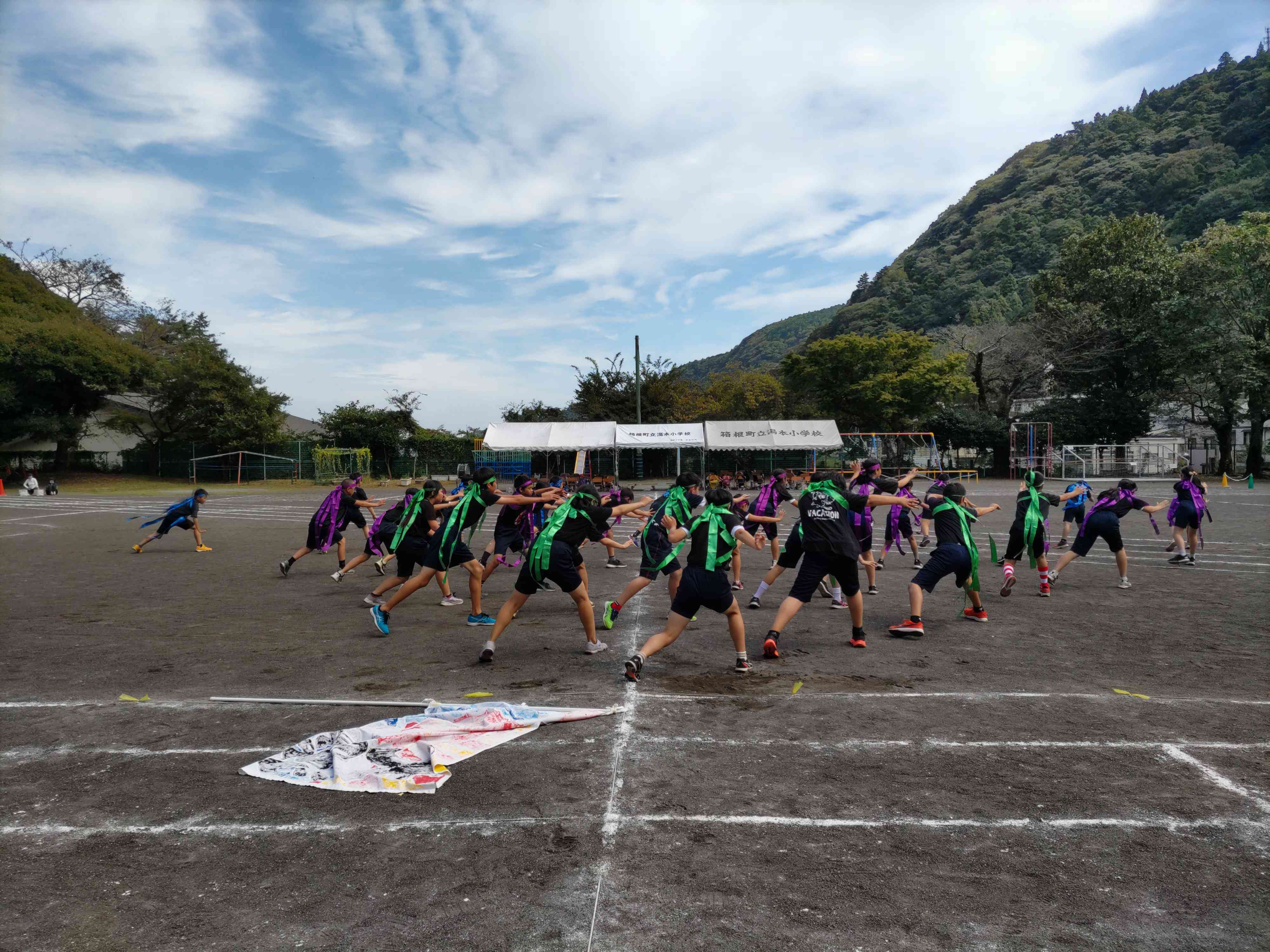 10月14日(土)秋晴れの快晴のもと、運動会を実施しました。今年度の運動会は、4年ぶりに地域・ご来賓の方々をお招きしました。 今年度の運動会スローガンは「元気いっぱい あきらめず挑戦する」です。個々に意気込みを発表してからスタートした徒競走、途中にかわいらしいダンスを入れた1~3年生による「玉入れ pon pon♪」、力を出し切った4~6年生の「ひっぱれ!ひっぱれ!」、そして一番大きな拍手をいただいた1~3年生の表現「スマイル戦隊 ユモユモレンジャー」、4~6年生による「力強くたくましく湯本ソーラン節」どの種目でも、子供たちの「元気いっぱい あきらめず挑戦する」姿が見られました。 コロナ禍では、感染症対策のため、観客を保護者のみに限定していましたが、今年度は、地域・ご来賓の皆様からも声援を送ってもらいました。今まで以上の応援に後押しされ、練習の成果を十分に発揮することができました。子供たちの顔は笑顔に満ち溢れていたように感じました。今回の運動会のように、「発表」という活動は、発表する場があるかないか、発表する対象がいるといないとでは、子供たちのモチベーションや出来栄えに大きく影響してきます。個人発表はもちろん、クラスの全員で行う活動(運動会や合唱・合奏など)はそれが大きく出ます。また、多くの人の前で緊張しながらやり切った達成感や充実感、失敗したときの悔しさなどが子供たちを大きく成長させます。 保護者・地域・ご来賓の皆様ありがとうございました。【添付ファイル】