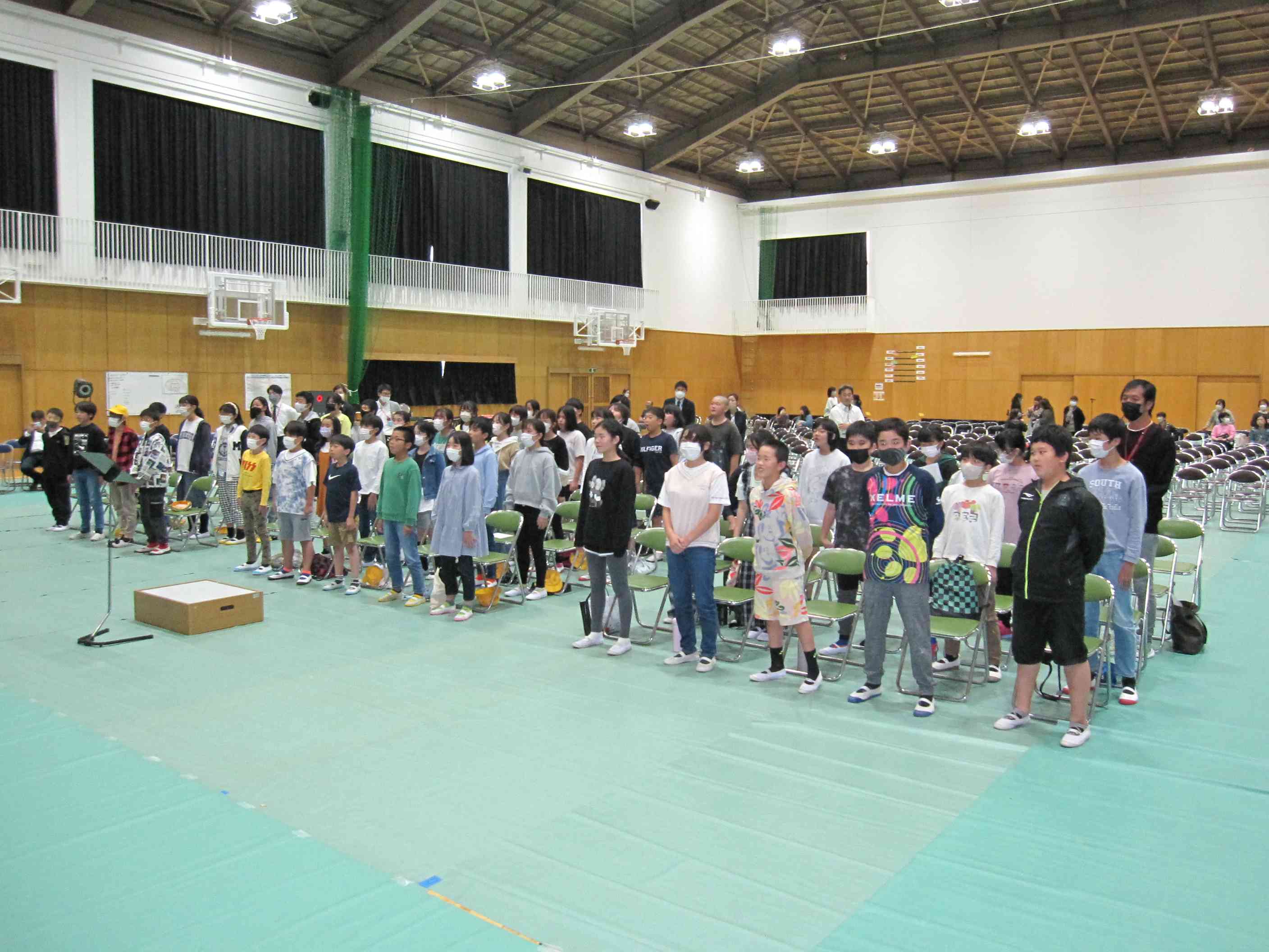 10月20日(金)6年生が箱根中学校の文化活動発表会(合唱コンクール)に参加してきました。この取組は、町園・小・中一貫教育の一つです。まずは、写真のように(練習風景です)3小学校の6年生が、中学生と一緒に「夢の世界を」を2部合唱しました。指揮者は中学校の音楽科の先生です。本校の5.6年生は普段から中学校の音楽科の先生に指導をしていただいているので、緊張することもなく、いつもの音楽の授業のように素敵な声を響かせることができました。 中学生の合唱は、各学年、クラスによってそれぞれのカラーが出ていました。きれいなソプラノ、迫力あるアルト他、多くの観客を前に堂々とした姿の指揮者や伴奏者。きっと、6年生一人一人が「中学生になったら・・・」という思いを抱いたことと思います。 小学校では最上級生として手本を示す立場の6年生が、先輩たちのすばらしい姿に刺激を受け、中学進学への期待を膨らませたことでしょう。【添付ファイル】