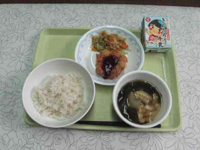 【今日のメニュー】 麦ごはん、油揚げの味噌汁、チキンカツ、キャベツと枝豆のソテー、牛乳 【栄養教諭から】 今日は、子どもたちの大好きなチキンカツ。運動会前に「活(かつ)」を入れる献立です! 給食で使用している味噌は、小田原の味噌蔵で作られているものを使っています。また、豆腐や油揚げは、地元のお豆腐屋さんの物です。野菜や肉だけでなく、加工品においても地産地消をめざしています。
