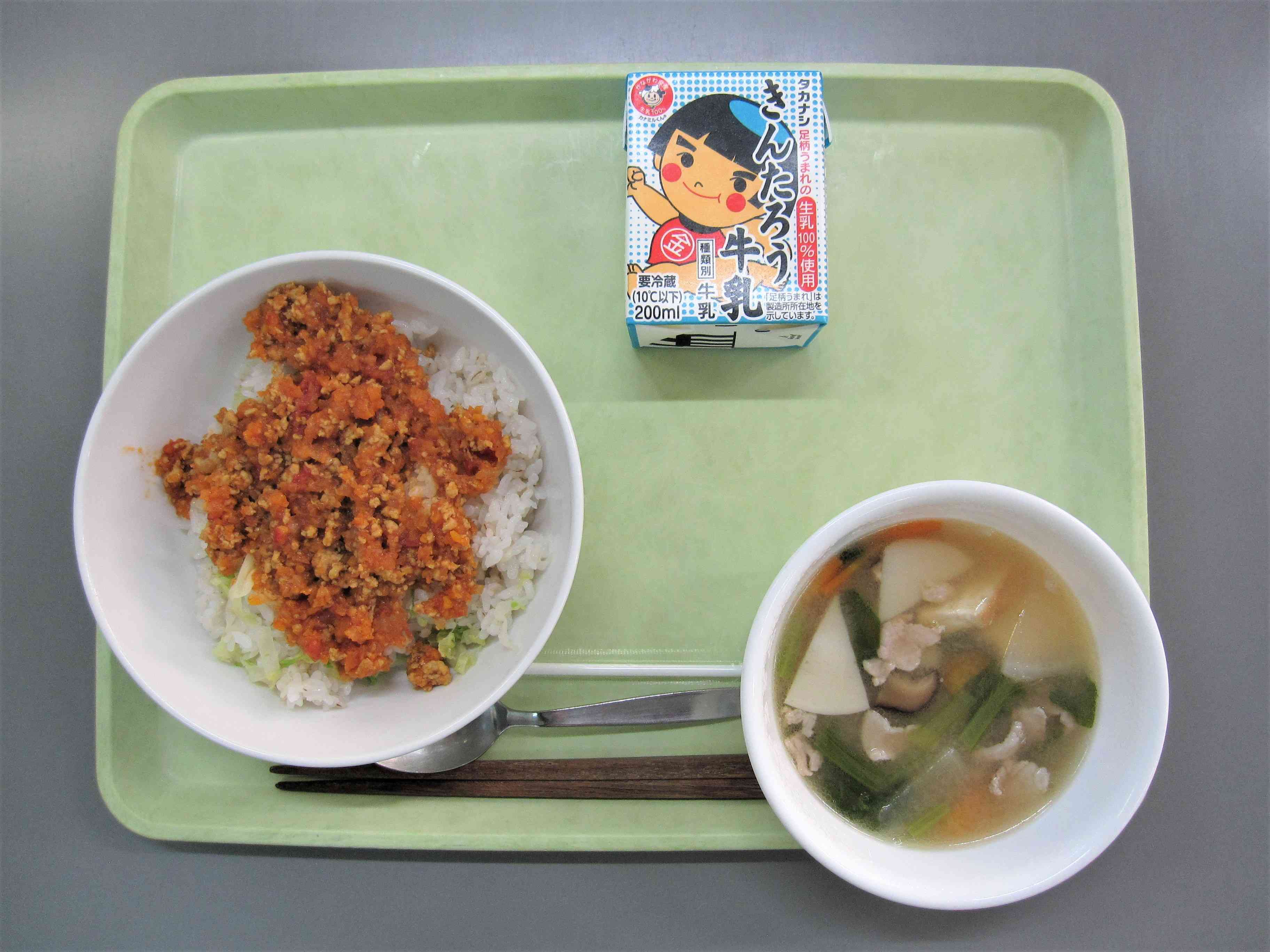 【今日の献立】 タコライス 牛乳 イナムドゥチ 【栄養士から】 イナムドゥチとは、「イノシシもどき」という意味になります。元々は、いのししのお肉を使っていましたが、今はぶた肉を使うようになったことから、イナムドゥチという名前が付いたそうです。 また、おつゆの中には、「カステラかまぼこ」という、魚のすり身と卵をたっぷり使った黄色いかまぼこも入れて、沖縄でのお祝い行事には欠かせないおつゆです。給食ではカステラかまぼこは用意できなかったので、普通のかまぼこを使いました。具だくさんで栄養満点のおつゆです。【添付ファイル】