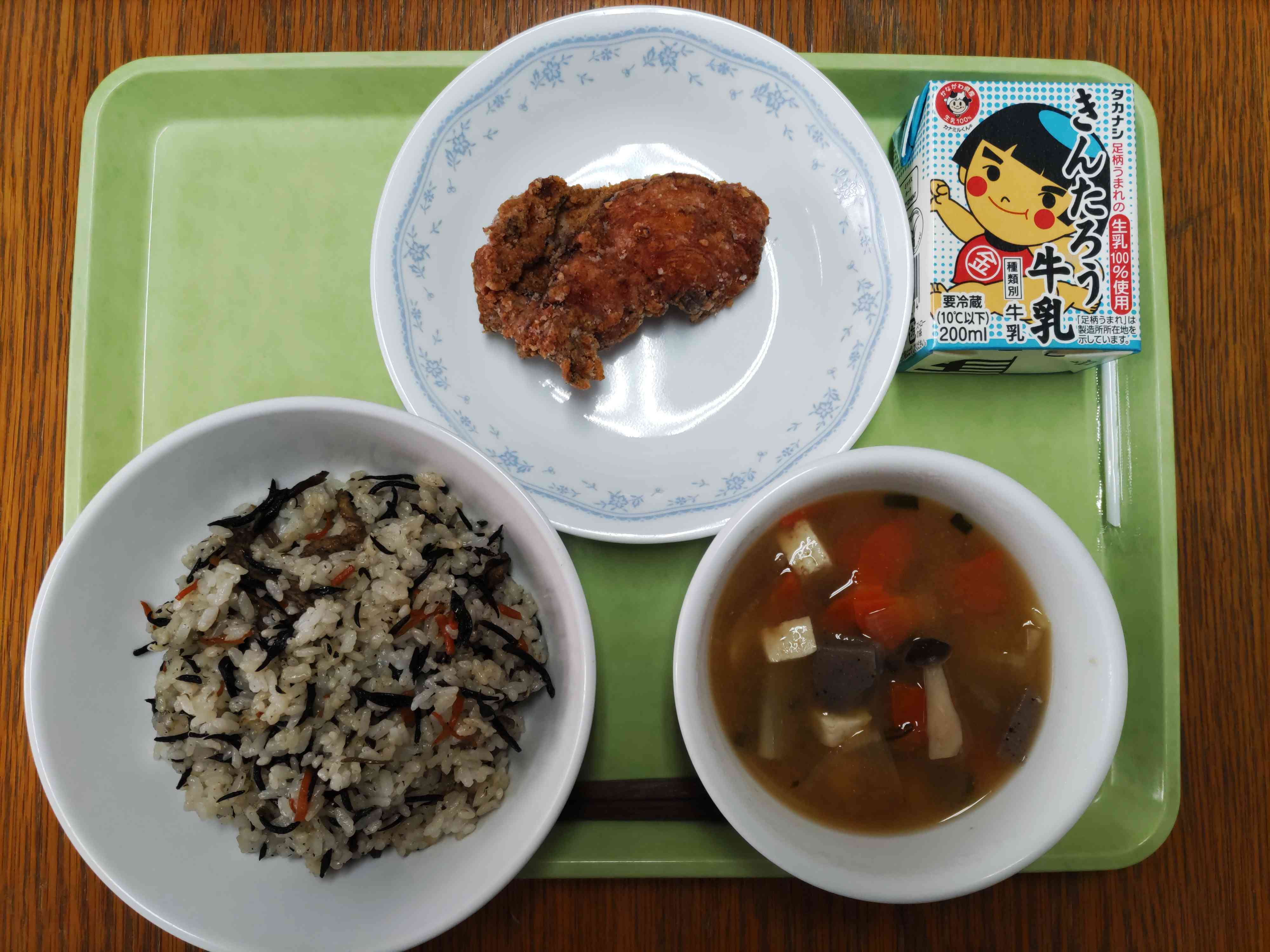【今日の献立】 ひじきごはん 牛乳 鶏のから揚げ みそけんちん 【栄養士から】 今日の献立は、けんちん汁をみそ味にアレンジした「みそけんちん」です。もとの「けんちん汁」は神奈川県の建長寺というお寺が発祥のお汁です。お寺で食べられていた精進料理なので、お豆腐を必ず使います。簡単で栄養も満点なので、今では全国で食べられています。