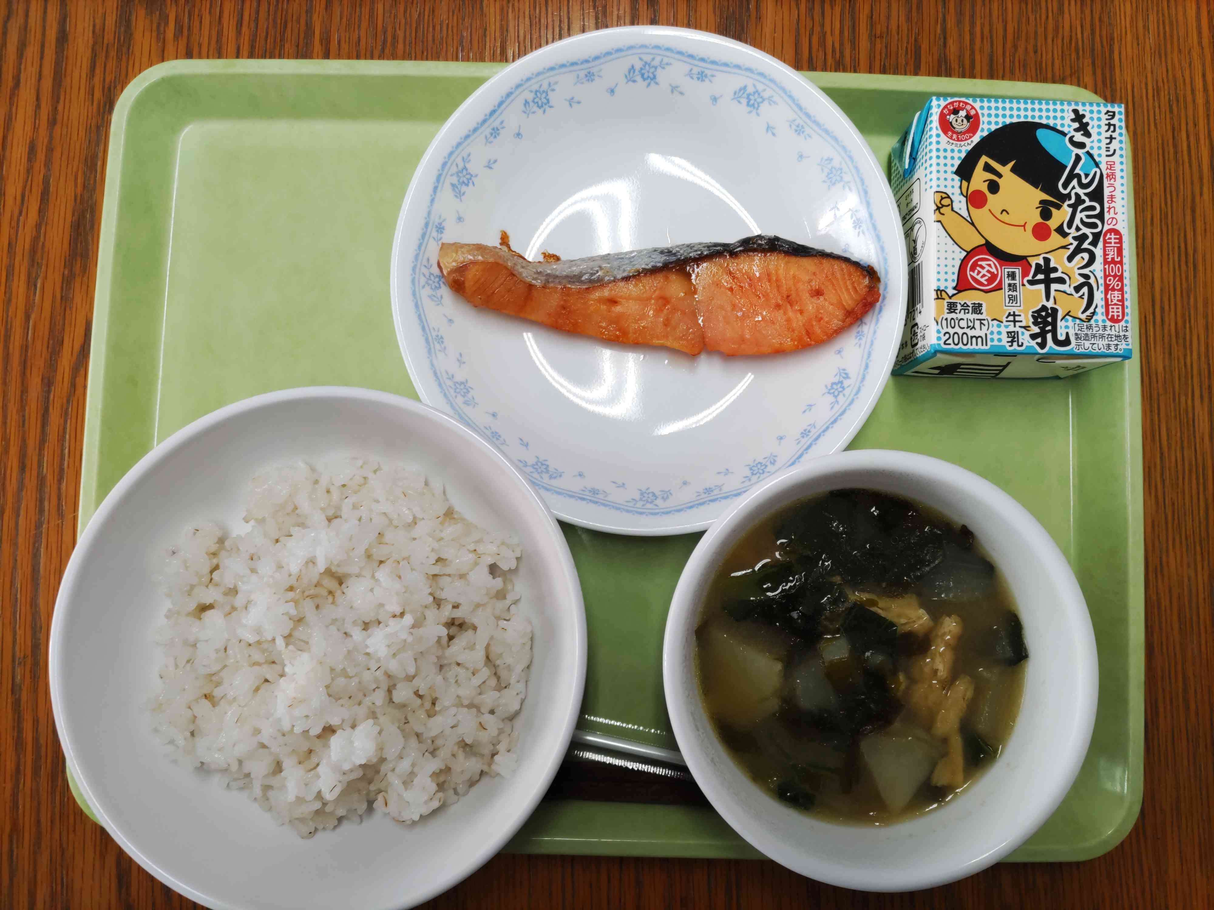 【今日の献立】 麦ごはん 牛乳 みそ汁 鮭の塩焼き 【栄養士から】 24日から給食週間が始まりました。24日、25日の2日間は給食ランキングから献立を決めたので、皆さんの食べたい物ばかりだったと思います。今日は、給食の歴史から献立を考えました。給食の始まりは、明治22年に山形県のお寺です。最初の給食の献立は、塩むすび、青菜のつけもの、さけの塩焼きでした。当時、おうちの事情で学校に行けない子やお弁当を持って来られない子どもたちのために、お寺のおしょうさんが、たくはつ(お経をとなえて寄付をしてもらうこと)をして集めたお金で食事をふるまったのが始まりです。【添付ファイル】