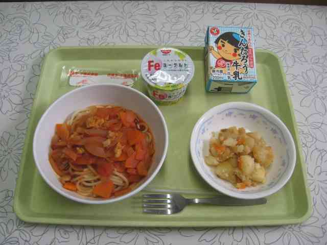 【今日のメニュー】 スパゲティトマトソース、変わりこふき芋、Feヨーグルト、牛乳 【栄養教諭から】 今日は小中一貫教育共通献立の「スパゲティトマトソース」と「変わりこふき芋」です。 トマトに含まれる「リコピン」は、ガン予防の効果があると言われています。変わりこふき芋はバターで炒め、しょうゆで味付けしました。