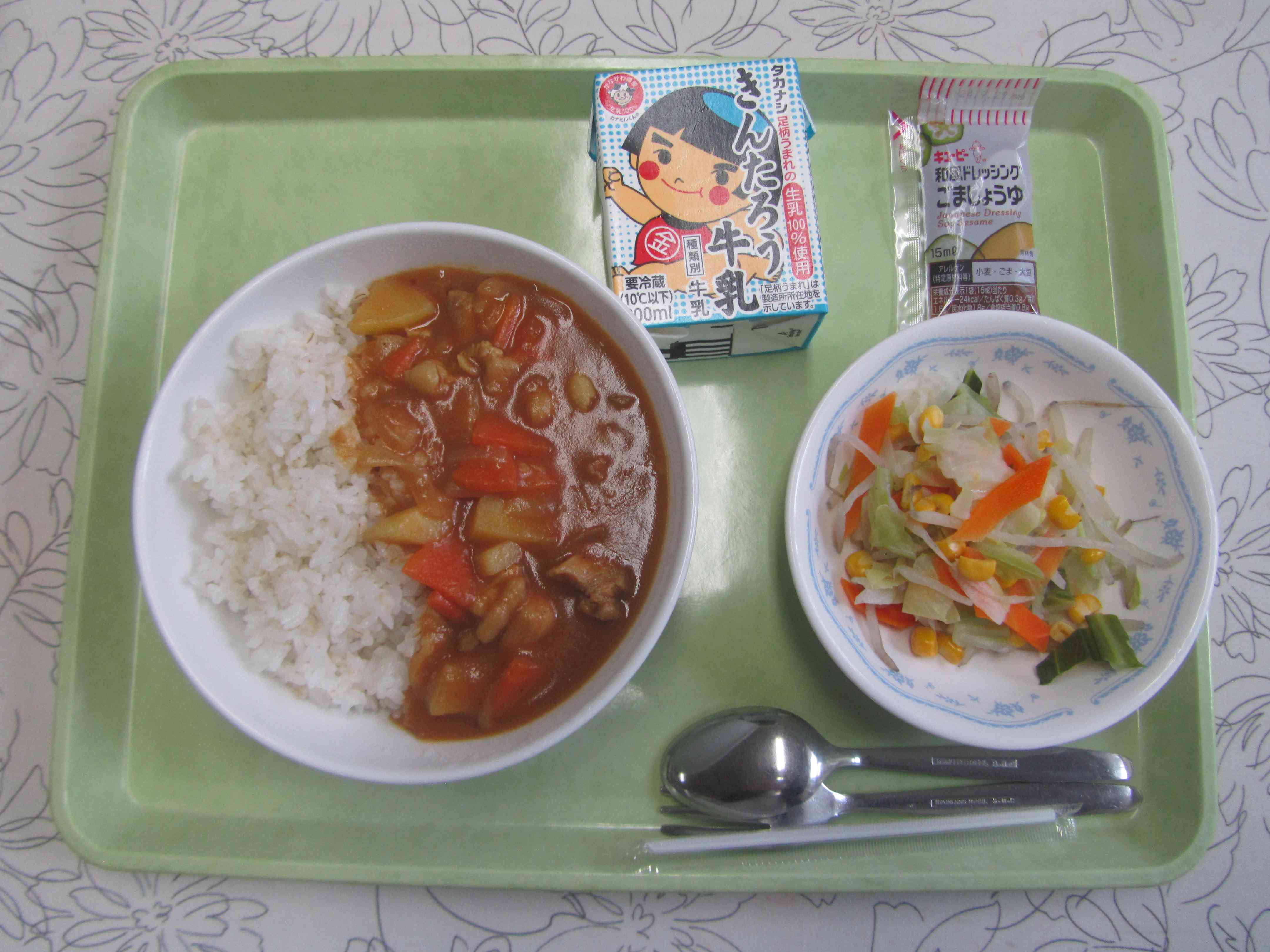 【今日の献立】 チキンカレー 牛乳 ゆで野菜 和風ドレッシング 【栄養士より】 今日は湯本小の給食の中でも人気なカレーライスです。ルウも手作りし、愛情を込めて作っています。 ごはんと一緒にカレーを食べる「カレーライス」はイギリスで初めてて作られました。インドの料理のカレーがイギリスに伝わり、ごはんと一緒に食べるスタイルとなり、そしてイギリスから日本に伝わりました。日本に伝わったカレーライスは、おいしくなるように色々と研究がされ、大正時代に今のようなカレーライスになり、広く食べられるようになりました。当時は、玉ねぎの栽培が盛んではなかったので、長ねぎをつかって作られていたそうです。 湯本小のカレーも色々な食材を使っておいしくなるように研究しています。今日はとり肉を使ったチキンカレーです。今日もたくさん召 し上 がれ!【添付ファイル】