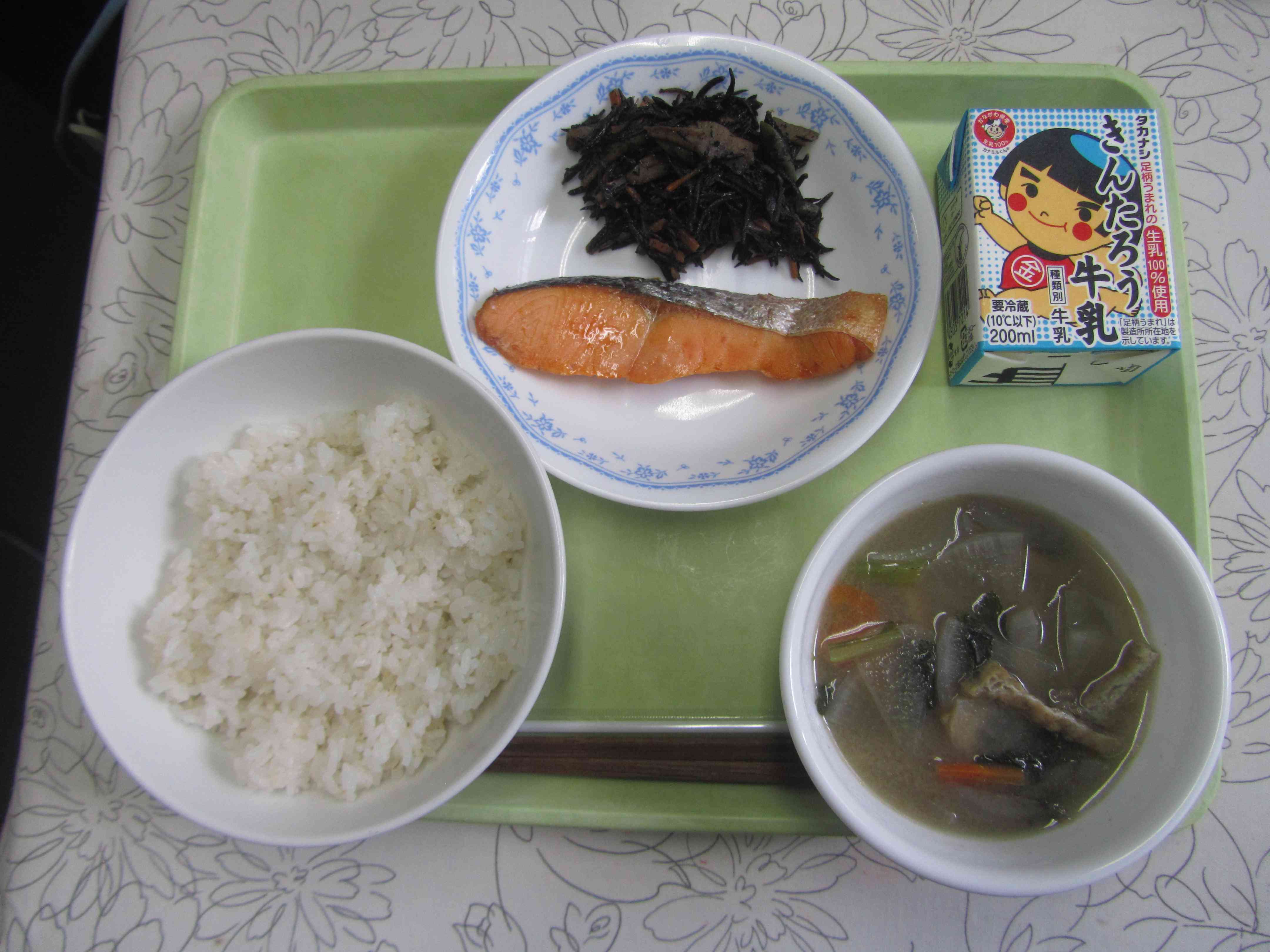 【今日の献立】 麦ごはん 牛乳 具沢山みそ汁 さけの塩焼き ひじきの煮物 【栄養士より】 今日のお魚はサケです。サケは英語でサーモンと言います。サーモン(Salmon)という言葉は、飛び跳ねる動きを表しています。サケは卵を産むときに、上流をめざし、川を上っていきます。その時に、ぴょんっと飛び跳ねる動きから、サーモン(Salmon)となりました。 サケは、川で生まれて海に出ます。そして、海で成長しますが、卵を産むときには、生まれた川にもどってきます。卵を産むとサケは死んでしまいます。 生き物の命に感謝していただきましょう。【添付ファイル】