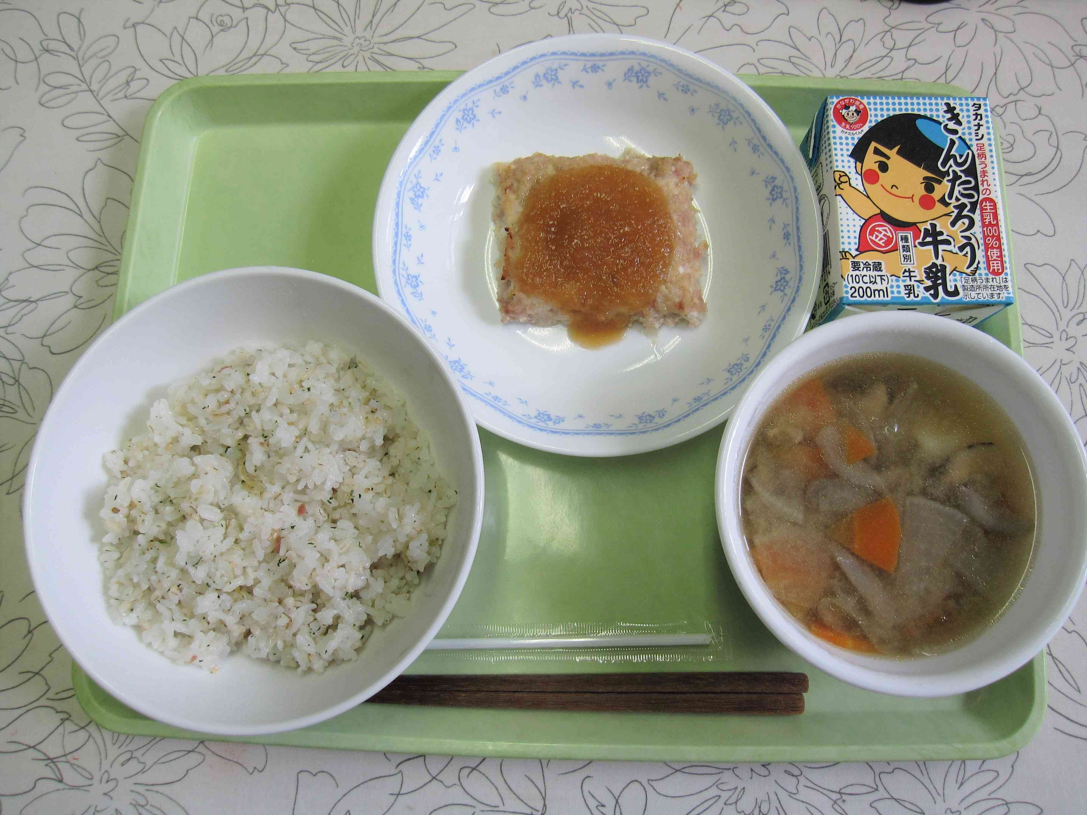 【今日の献立】 うめちりごはん 牛乳 さつま汁 和風ハンバーグ 【栄養士より】 今日のおつゆは鶏肉と野菜がたっぷり入った鹿児島県の郷土料理「さつま汁」です。 鹿児島県は、その昔「さつまの国 」と呼ばれていたことから「さつま汁」という名前になりました。「さつま汁」は、お祝いの席など特別な日に食べるものだったそうですが、今では特に決まった時期はなくいつでも食べられています。 鹿児島県は、昔から鶏の飼育が盛んで、さつま地鶏などのようにブランド化された鶏肉が何種類もあります。給食でも鹿児島県産の鶏肉をよく使います。 鶏肉と野菜がたくさん入った栄養満点のさつま汁をたくさん食べて、元気に過ごしましょう。【添付ファイル】