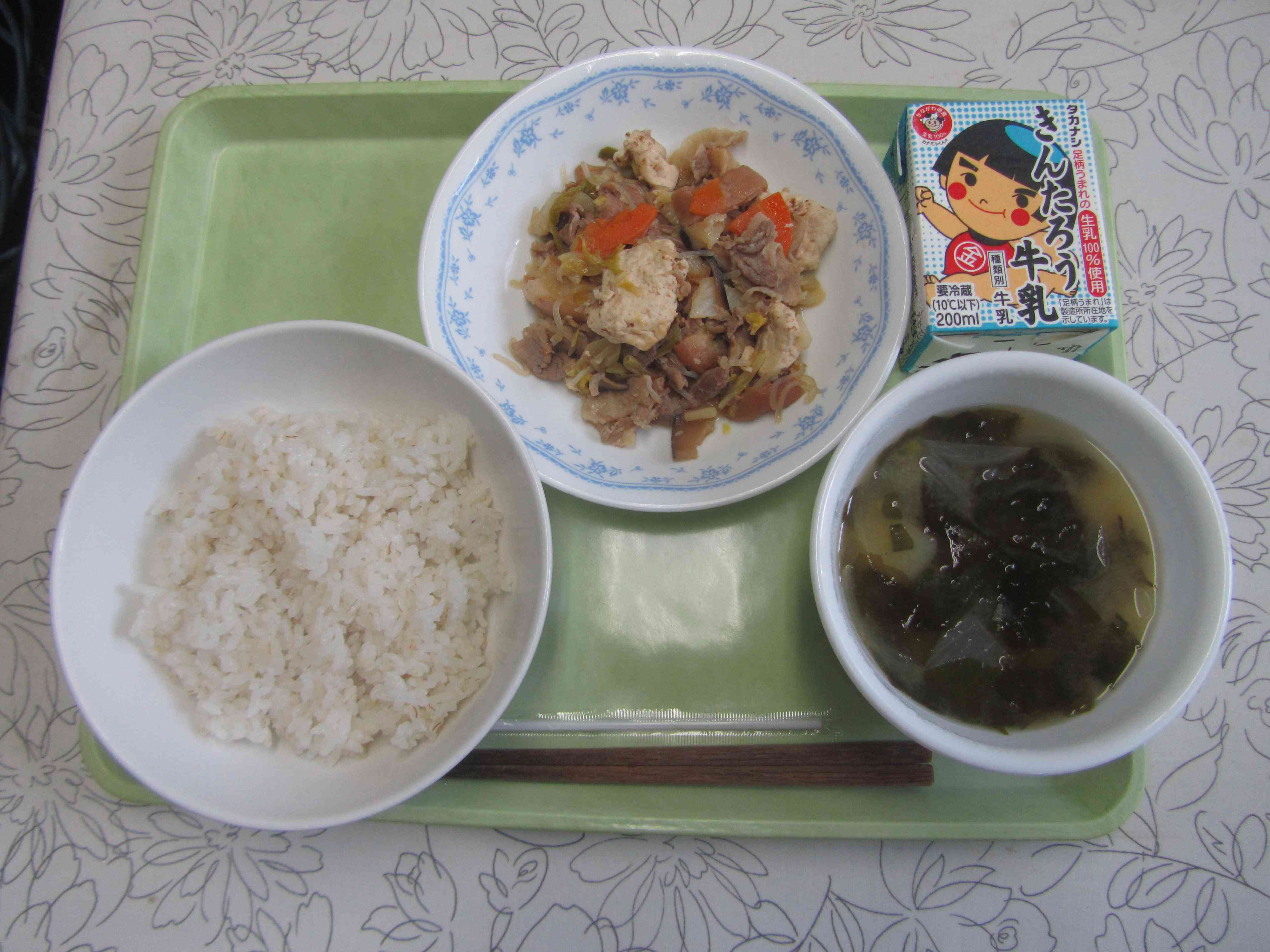 【今日の献立】 麦ごはん 牛乳 みそ汁 すき焼き 【栄養士より】 今日の献立はすき焼きです。「鋤(すき)」というシャベルのように畑の土を掘り起こす農工具を鉄板の代わりにして、お肉などを焼いて食べたことが「すき焼き」の始まりと言われています。 お肉を食べるということは、もともと外国から伝わった食文化ですが、すき焼きは、しょうゆで味付けをして食べる日本の食べ物です。 すき焼きは、本当は牛肉で作りますが、給食では豚肉で作りました。今日のすき焼きには、地元のお豆腐屋「萩野さん」のお豆腐とたっぷりの野菜と車麩が入っています。お肉と一緒に野菜もたくさん食べましょう。【添付ファイル】