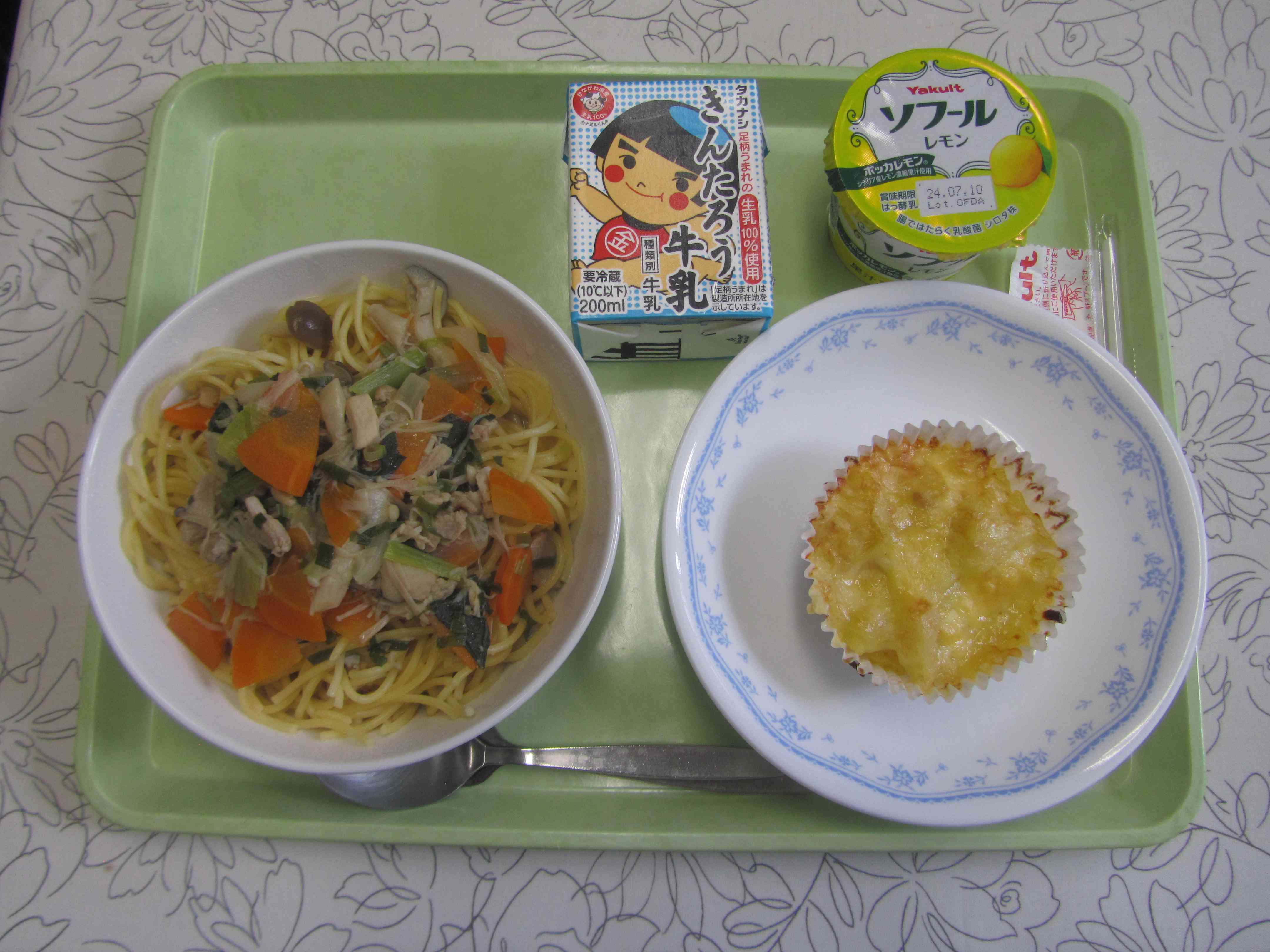 【今日の献立】 和風 スープスパゲッティ 牛乳 ポテトのチーズ焼き レモンヨーグルト 【栄養士より】 今日の和風スープスパゲッティは、きのこや葉ねぎを使 って、しょうゆベースの味付けにしました。きのこはしめじとえのきたけを使用しました。きのこはビタミンDや食物繊維が豊富なので積極的に食べてもらいたい食品の1つです。 きのこが苦手でも「苦手だけど食べられた」と報告してくれる子もいます。給食をきっかけに子供ちが食べられる食品が増えたらいいなと思いながら献立を考えています。 今日の献立はいかがでしたか?【添付ファイル】