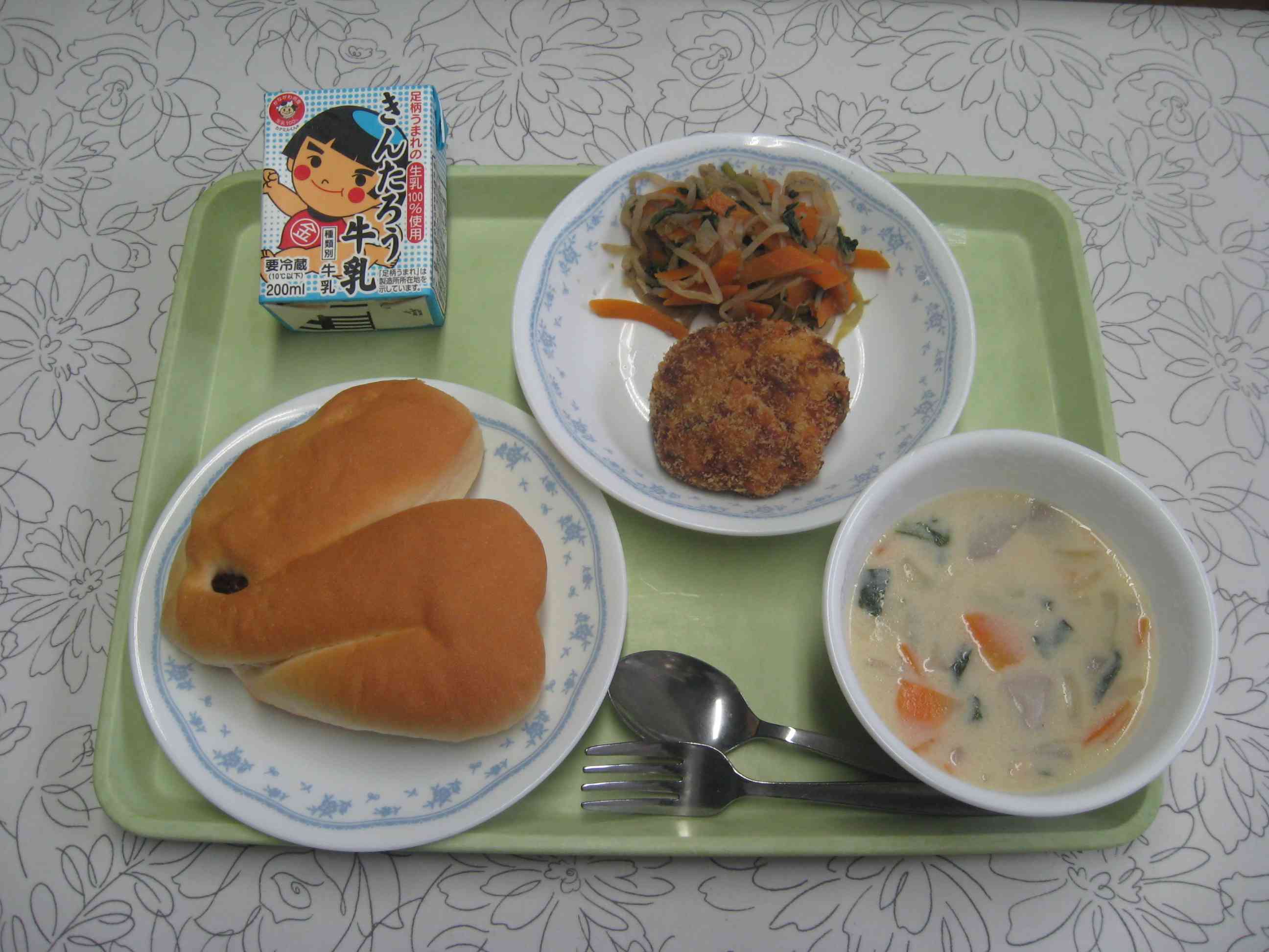 【今日のメニュー】 うさぎパン、お月見シチュー、お月さまコロッケ、野菜のごまあえ、牛乳 【栄養教諭から】 今日は、小中一貫教育共通献立でお月見メニューです。「月にはうさぎ!」と言うことで、パンも横向きのうさぎ型をしています。今年の十五夜は24日。十五夜は「いも名月」とも言い、里芋を食べる風習があります。そこで、お月見シチューには里芋とお月見団子の白玉が入っています。コロッケもカボチャを使って、黄色く丸い満月に見立てて作りました。【添付ファイル】