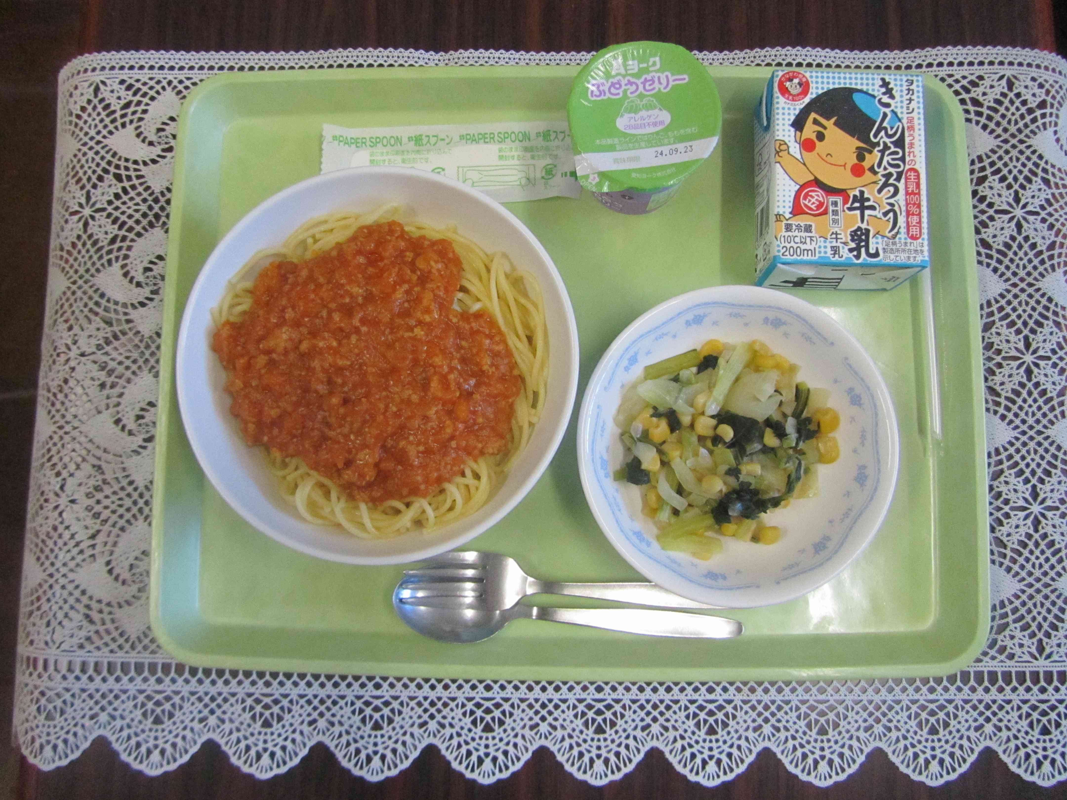 【本日の献立】 スパゲティミートソース 牛乳 青菜とコーンのソテー ぶどうゼリー 【栄養士より】 今日は人気メニューのスパゲティミートソースです。 ミートソースは、にんにくやセロリなどの香味野菜とひき肉 、トマトを煮込んで作 ります。最初にみじん切りにしたにんにくとセロリを香りが出るまで油で炒めるのですが、給食室中にとってもいい香りが広がり食欲がそそられます。ひき肉と一緒に大豆ミートも入れて不足しがちな鉄分も補えるようにしました。 こだわりのミートソースのお味はいかがですか?【添付ファイル】