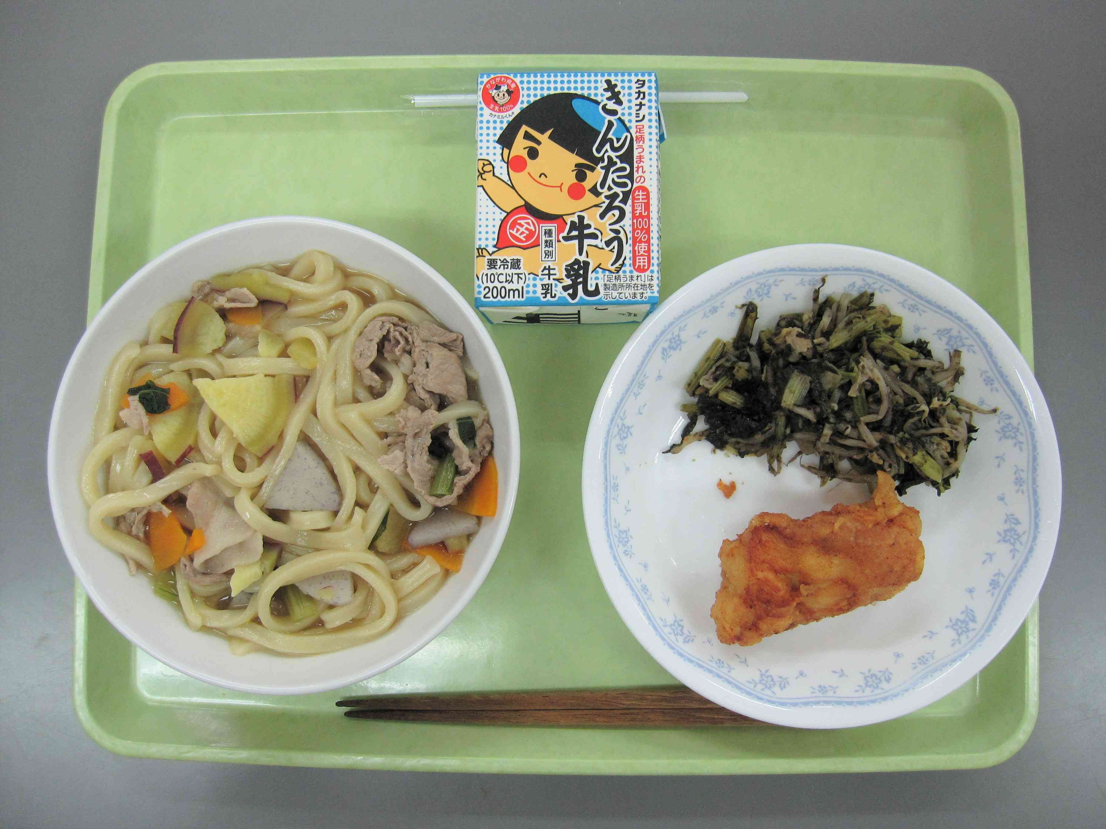 【今日の献立】 芋名月うどん 牛乳 とり天 いそか和え 【栄養士より】 今日9月17日は十五夜です。十五夜は別名「中秋の名月」とも言われており、この日にススキやお団子をお供えして月を眺めながら、農作物の豊作をお祈りしたり、感謝を表したりします。この頃に収穫される里芋をお供えすることから、「芋名月」とも呼ばれているそうです。 今日のうどんには芋名月にちなんで、さつまいもと里芋が入っています。 食べ物を作ってくれる生産者の方や調理員さんたちに、いつも以上に感謝しながら食べましょう。【添付ファイル】