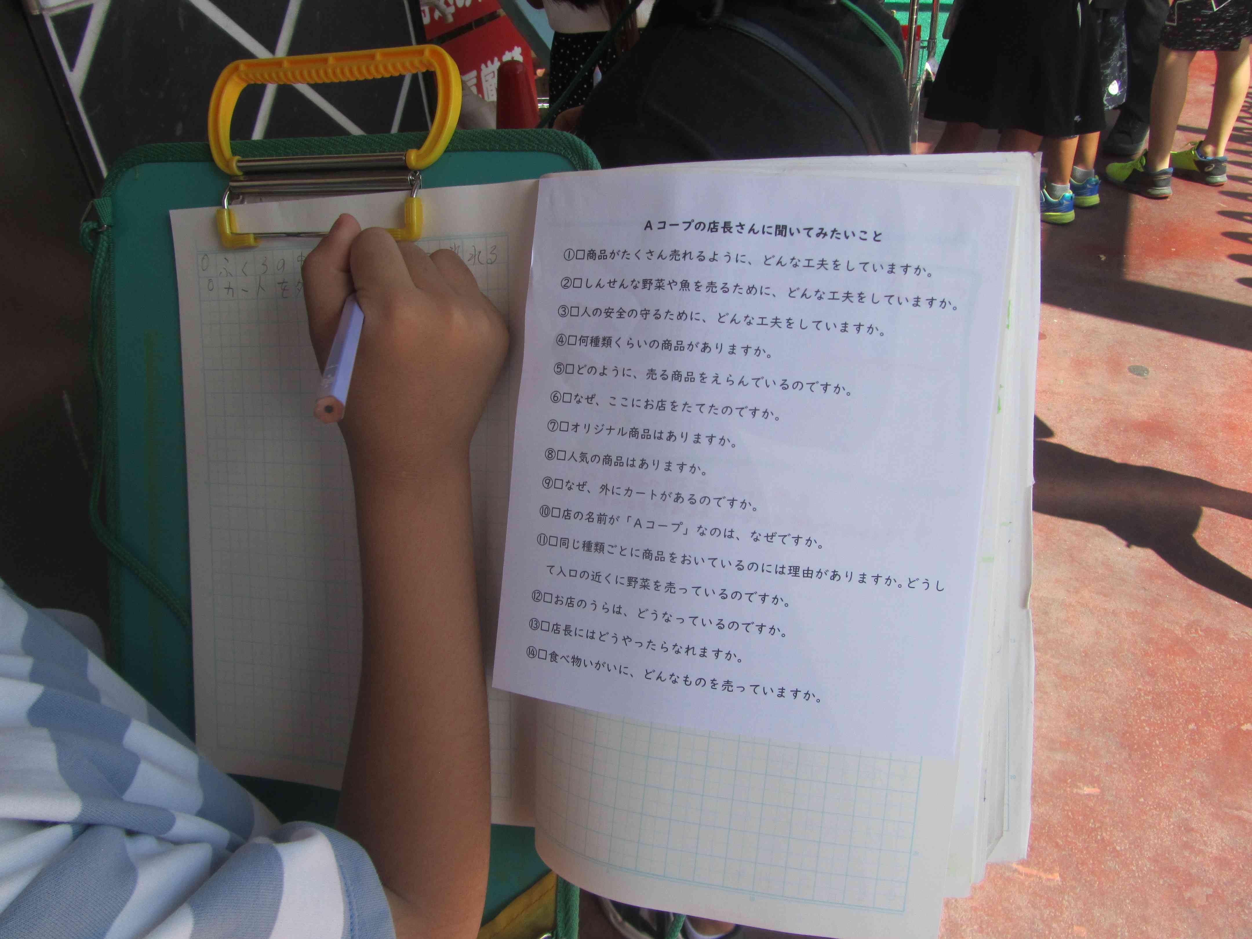 3年生が、「スーパーマッケトのひみつ」を調べに、A-COOP 仙石原店にスクールバスに乗って行きました。 最初に自分たちだけで店内を回り、気がついたこと、工夫していることなどをメモに取ったり、店長さんに質問したりしました。 次に、お惣菜を作る部屋、事務室、野菜を切ったり袋に詰めたりするための部屋、魚・肉を切ってトレーにのせるなどの作業する部屋などを見せていただきました。 設定温度が異なる冷蔵庫を2カ所見せていただき、設定温度を変えている理由を教えてもらいました。 最後に、店長さんに質問させてもらったのですが、一つ一つ丁寧に答えてくださったので、どの子のノートも『スーパーマーケットのひみつ」でいっぱいになりました。見学させてくださって本当にありがとうございました。 今後は、今日見学して学んだことをもとに、スーパーマーケットで働く人のこと、流通について、そして、自分が買い物をするときの工夫についてなどに学習を深めていきます。【添付ファイル】
