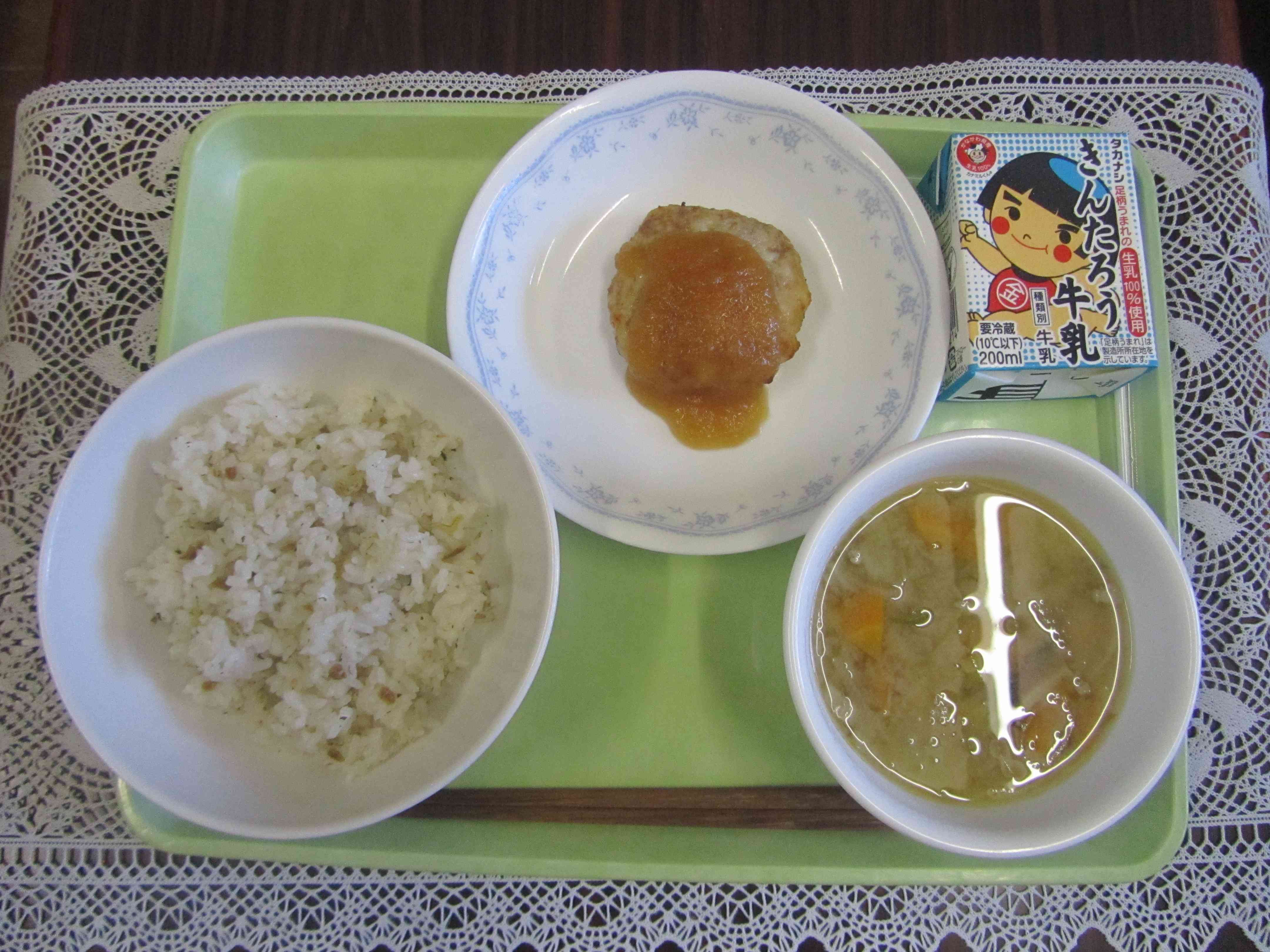 【今日の献立】 うめちりごはん さつま汁 和風 ハンバーグ 【栄養士より】 今日のおつゆ「さつま汁」は鹿児島県の郷土料理です。 鹿児島県は、その昔「さつまの国 」と呼ばれていました。さつま汁は、江戸時代から鹿児島県で食べられていたとり肉と野菜がたくさん入ったおつゆです。昔は、お祝いの席など特別な日に食べるものだったそうですが、今では特定の日ではなく、いつでも食べているそうです。 鹿児島県は、昔から鶏の飼育が盛んで、さつま地鶏などブランド化されたとり肉が何種類もあります。給食の材料としても鹿児島県産のとり肉がよく届きます。 さつま汁は、とり肉と野菜がたくさん入った栄養満点のおつゆです。たくさん食べて、元気に過ごしましょう。【添付ファイル】