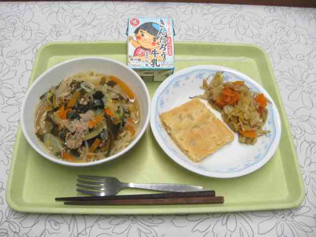 【今日のメニュー】 味噌ラーメン、野菜のオイスター炒め、アップルケーキ、牛乳 【栄養教諭から】 今日は、子どもたちが大好きな味噌ラーメンです。多くなりがちな塩分は、ガラスープとかつお節からとる2種類の出汁と、たっぷりの野菜のうま味を活かすことで、ひかえめにしました。