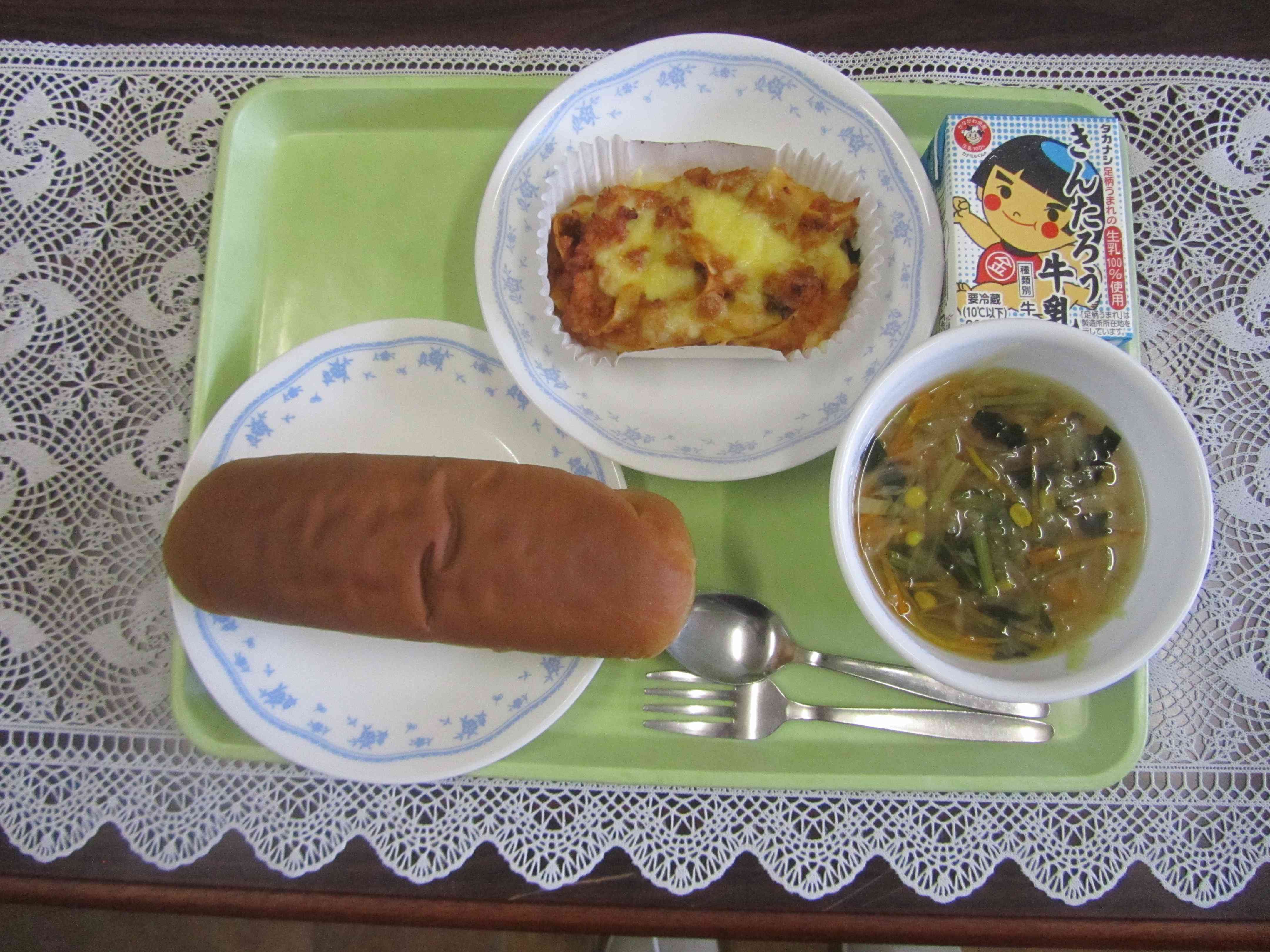 【今日の献立】 黒パン 牛乳 千切り野菜スープ ラザニア 【栄養士より】 今日は「ラザニア」です。ラザニアとは板状のパスタのことを指します。また、そのパスタを使って作る料理のことも「ラザニア」と呼びます。「ラザには」は、お皿に、パスタ・ソース・チーズを何層も重ねて、オーブンで焼いた料理です。給食でも何回か登場しましたね。 給食のラザニアは、ラザニア(平らなパスタ)の代わりに乾燥状の短冊形のワンタンの皮をゆでて使いました。お味はいかがですか?【添付ファイル】