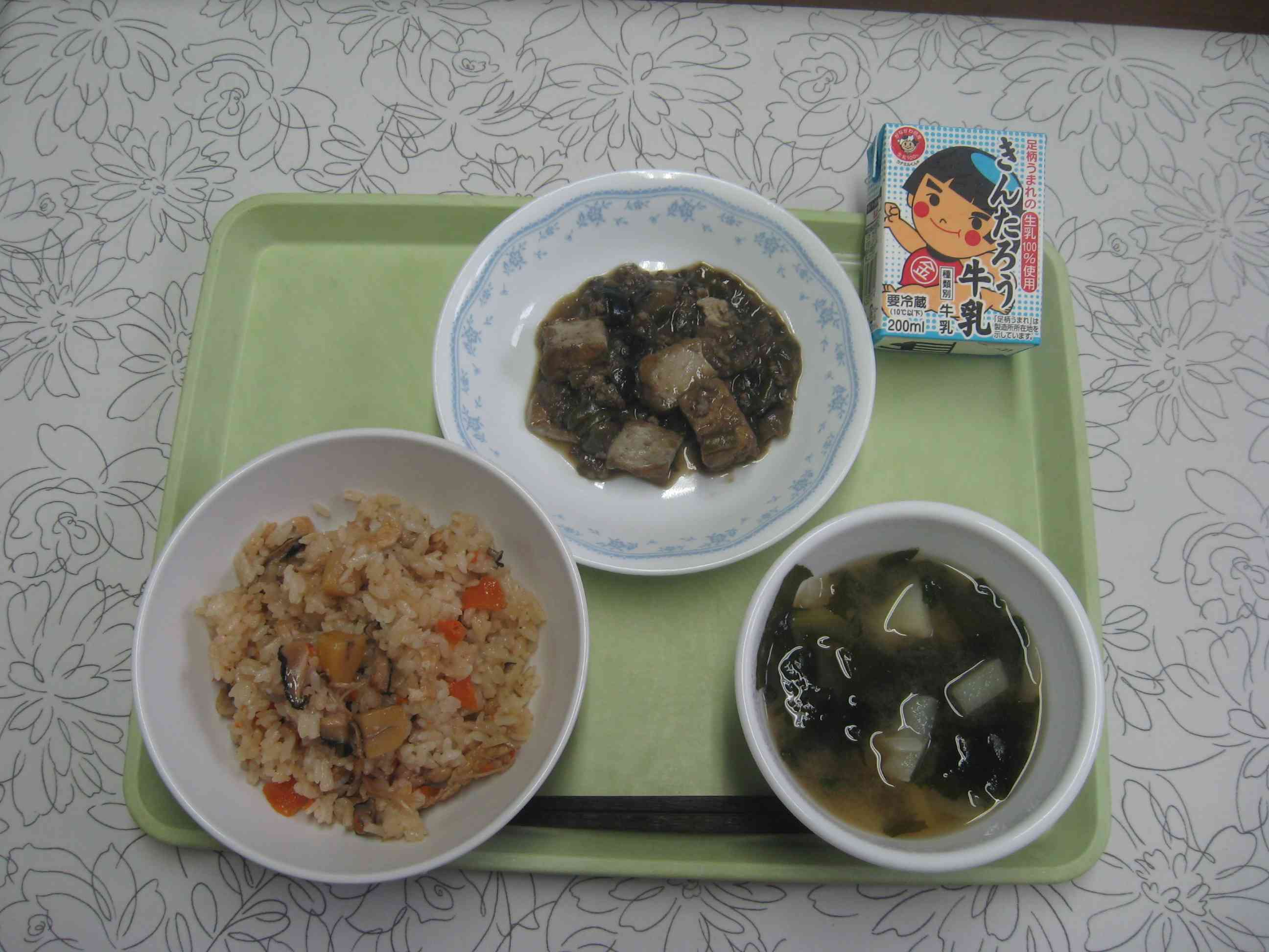 【今日のメニュー】 秋いっぱいご飯(炊き込みおこわ)、生揚げのピリ辛炒め、ジャガイモの味噌汁、牛乳 【栄養教諭から】 今日は、秋がいっぱい入った炊き込みおこわです。しいたけ、えのき、しめじ、そして栗が入っています。きのこ類を入れるとうま味がアップするのですが、残念ながら苦手な子も多い食材です。食物繊維も豊富で食べてほしい食材なので、子ども達の食べやすい調理方法を日々試行錯誤中です。
