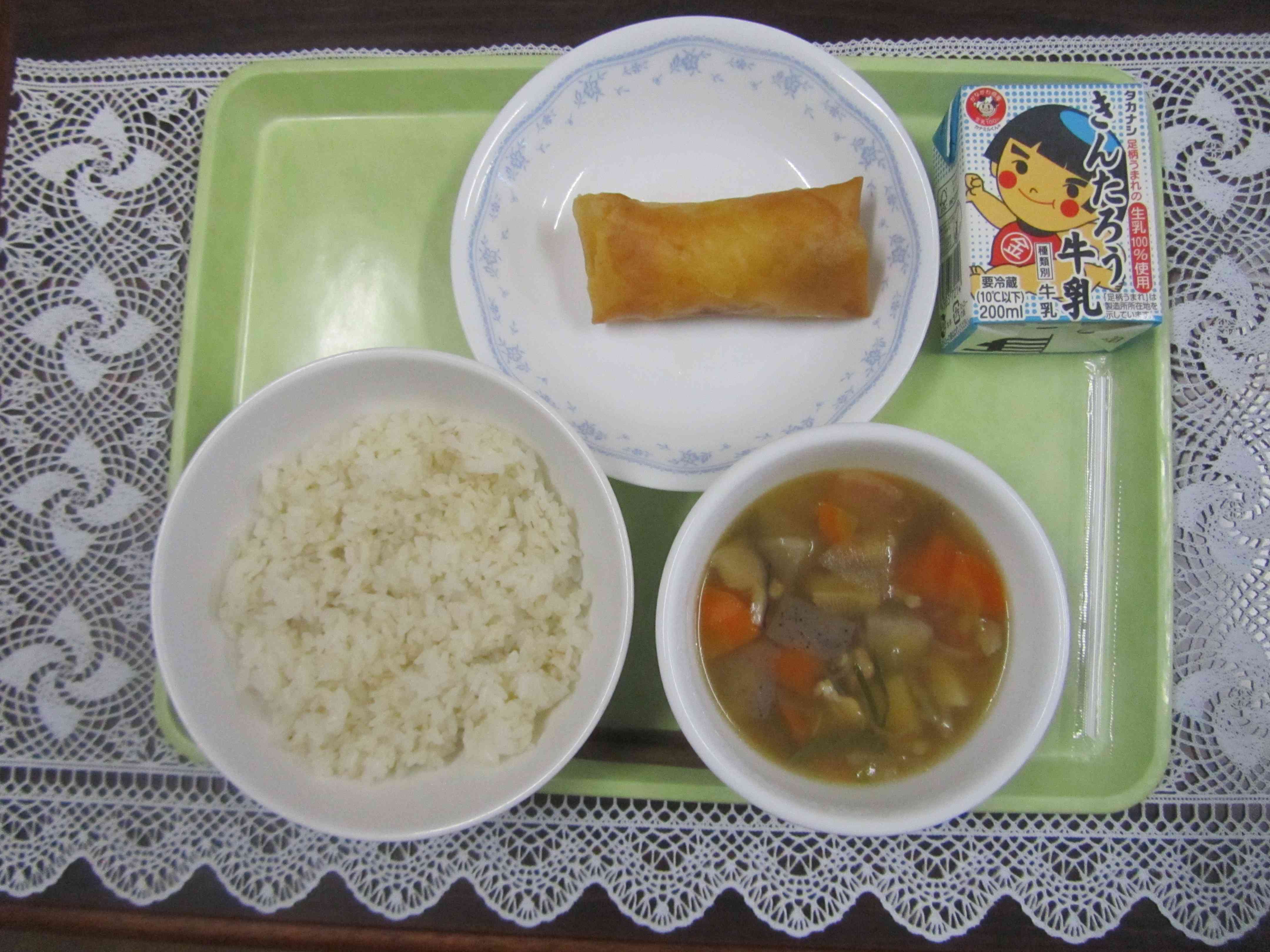 【今日の献立】 麦ごはん 牛乳 のっぺい汁 めかじきのまきまき揚げ 【栄養士より】 今日のおつゆの名前は、のっぺい汁です。里芋や片栗粉でとろみを付けた汁物です。のっぺりとしたとろみがあるところから、のっぺい汁 と呼ばれているそうです。 また、のっぺい汁は、新潟県の郷土料理でもあります。里芋をはじめ、季節の野菜や新潟県でとれるサケを入れたりするそうです。 とろみをつけると冷めにくくなるので、のっぺい汁は、冬にピッタリのお汁です。お野菜の栄養もたくさん溶け込んでいます。たくさん食べて、元気な体をつくりましょう。【添付ファイル】