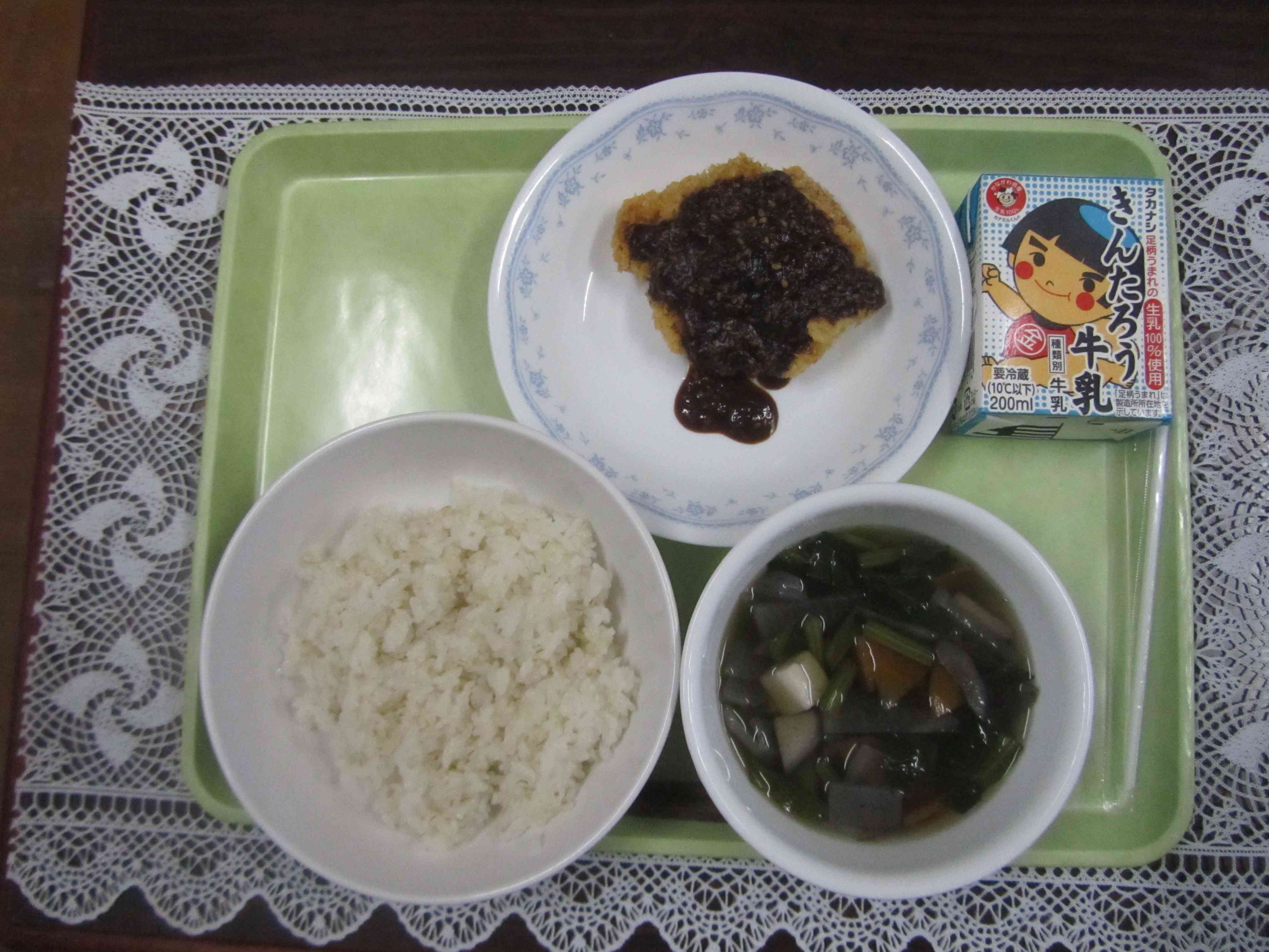 【今日の献立】 麦ごはん 牛乳 けんちん汁 みそカツ 【栄養士より】 今日は愛知県名古屋市のご当地グルメの「みそカツ」です。東海地方にはとんかつを提供するお店で、みそカツを置かない店はほとんどない!と、言われるほどのソウルフードです。 みそカツのルーツにはいくつか説がありますが、浅草で天丼も出すそば屋の亭主が、終戦と同時にふるさとの名古屋に帰り、天丼のタレをヒントに「しょうゆでできるなら、味噌でも出来るはず。」と、名古屋の名物食材である八丁味噌をとかしてタレを作ったのが始まりだと言われています。 みそカツには八丁味噌という赤味噌を使います。今日のみそカツのタレにも八丁味噌が入 っています。独特な香りが特徴の味噌です。お味はいかがですか?【添付ファイル】