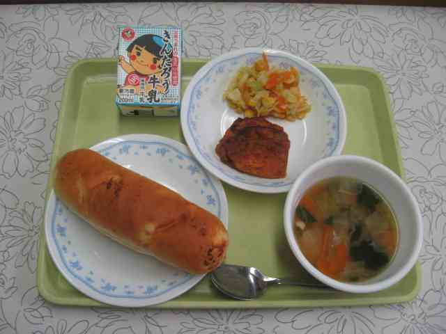 【今日のメニュー】 チーズパン、ABCスープ、タンドリーチキン、キャベツとコーンの炒め物、牛乳 【栄養教諭から】 「ABCスープ」は、アルファベットの形をしたマカロニが入っているスープです。(写真では沈んでいて、よく見えずごめんなさい!)子どもたちは大好きで、アルファベットで自分の名前を探したりしながら、楽しく食べています。 「タンドリーチキン」は、カレー粉、ケチャップ、ヨーグルト等によく漬け込んで焼きます。香りがよく、食欲をそそります。【添付ファイル】