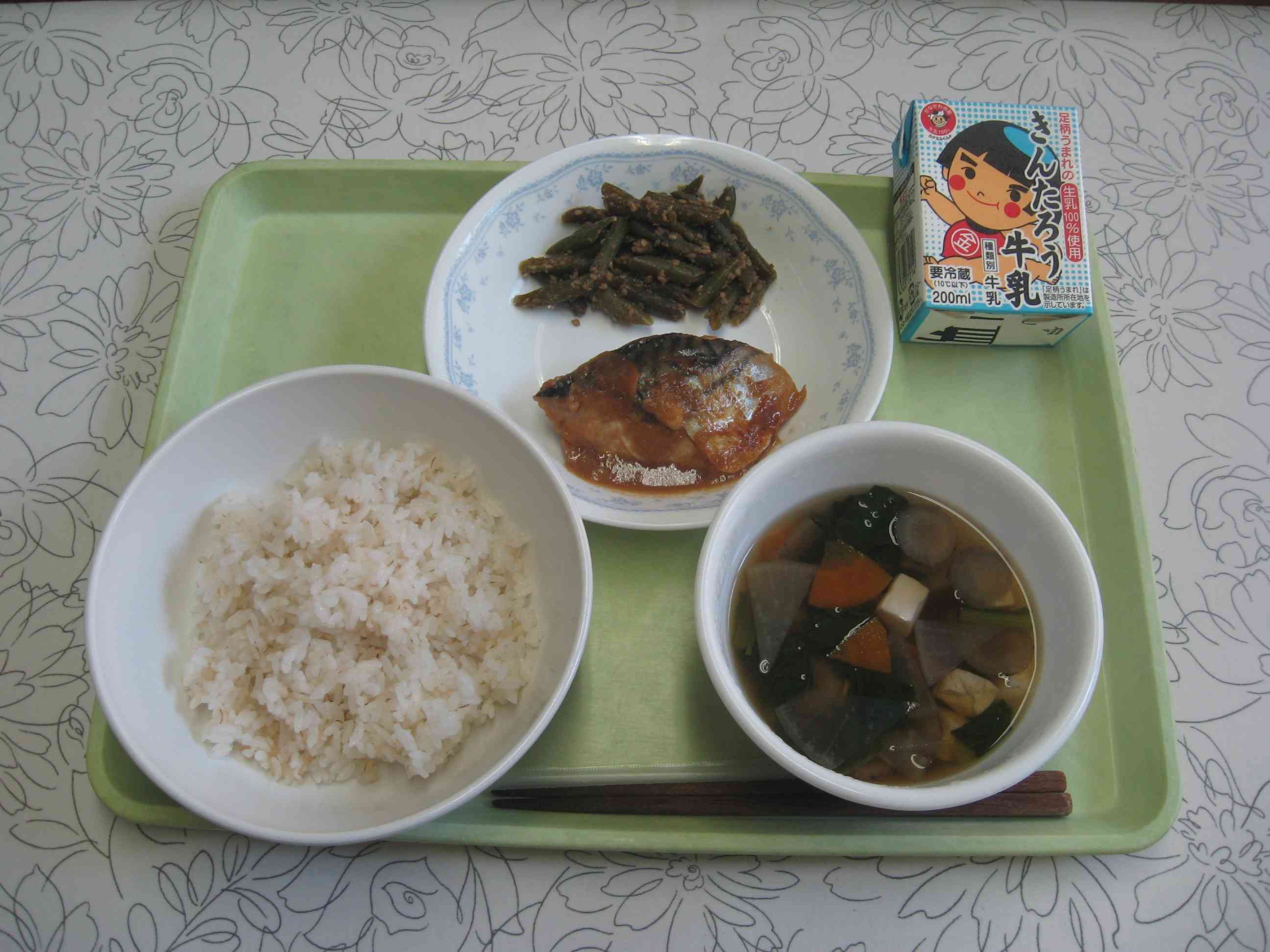 【今日のメニュー】 麦ごはん、具だくさん汁、さばの味噌煮、いんげんの胡麻和え、牛乳 【栄養教諭から】 給食での「さばの味噌煮」は、回転窯と言う大きなお釜で、全校分を一気に煮ていきます。煮崩れしないように、一枚ずつていねいに並べて入れ、30分程煮ると完成です。くさみ取りにショウガを入れて煮ています。実は子どもたちは、この煮たショウガも大好きです。辛くないように、調理員さんたちが職人技で薄くスライスしてくれています。