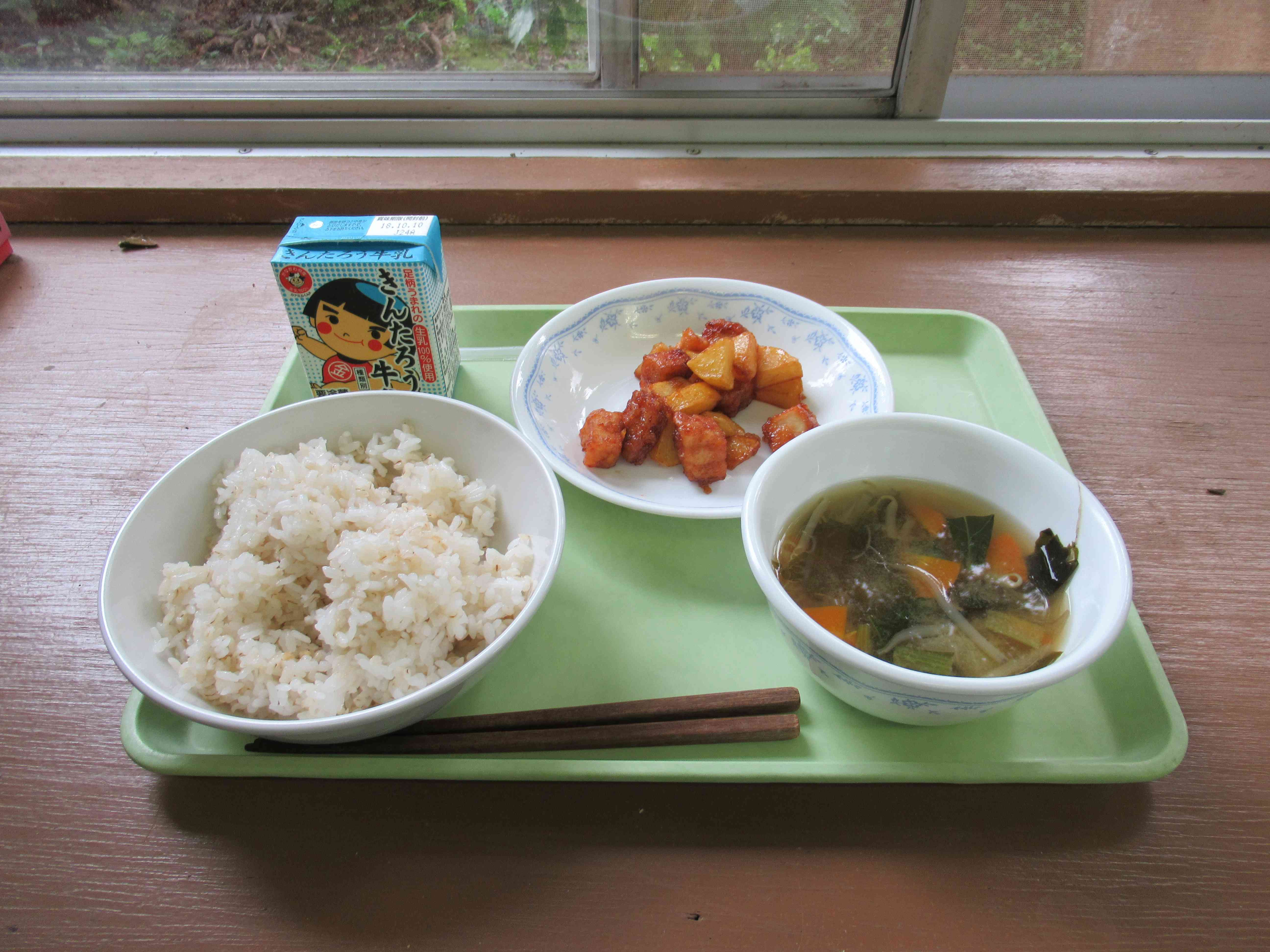 今日は5,6年生が箱根町小学校体育大会に参加しているので、いつもは2つの炊飯器を使うところ、1つで炊けてしまいました。揚げたメカジキを甘辛く、かりんとうのように味付けをした「メカジキのかりんとう風」は、ごはんのおかずにピッタリです。素揚げしたじゃがいもも加え、量もしっかりあります。