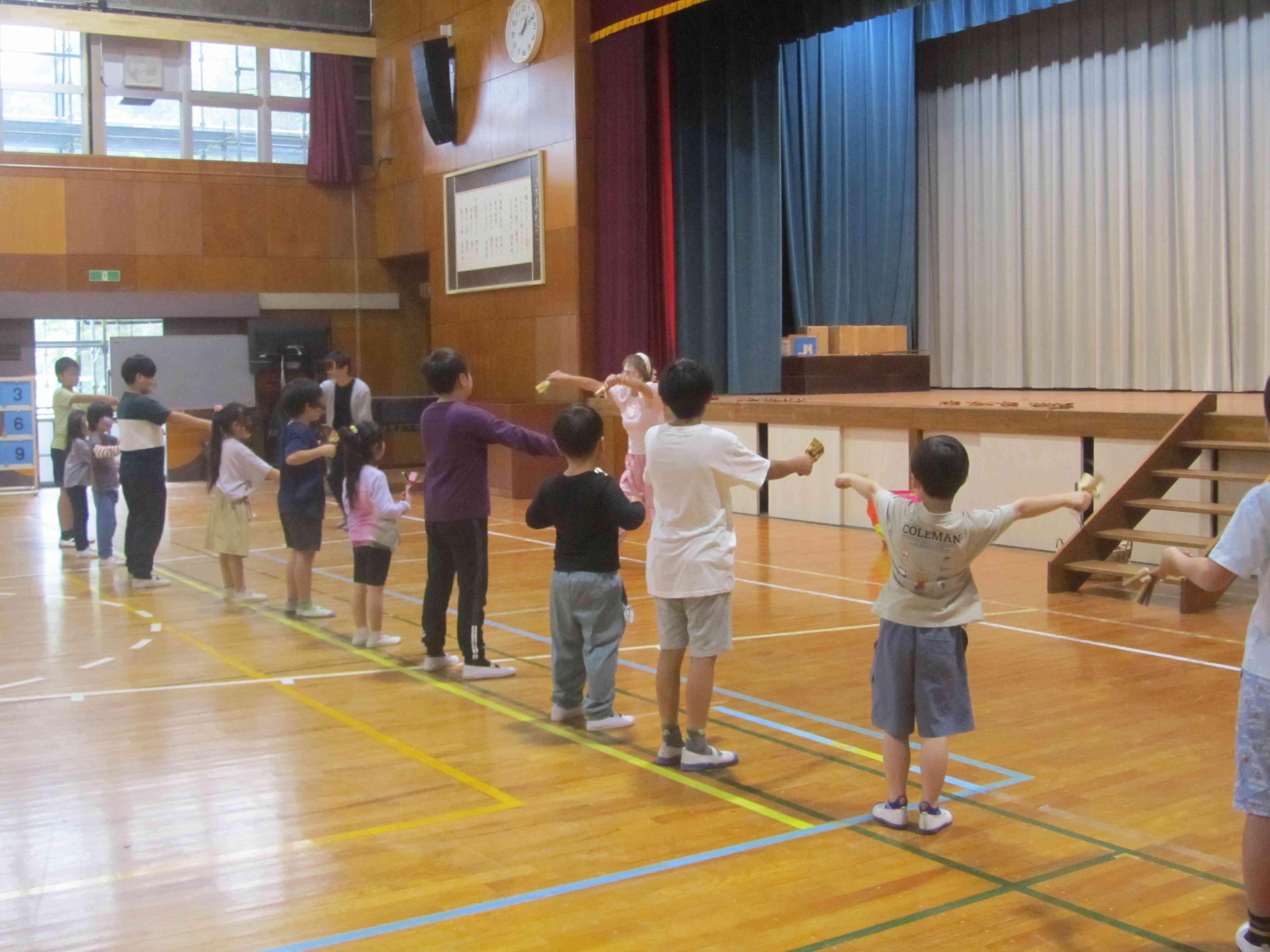 ソーラン座の方が昼休みに教えにきてくださいました。 おなじみの「ジンギスカン」を元気よく踊った後、新曲の「学園天国」を教えていただきました。 かわいいポーズもあり、みんなノリノリです。 子供たちが使わせていただいている鳴子は、寄せ木細工でできているからでしょうか、とてもいい音が鳴っていました。