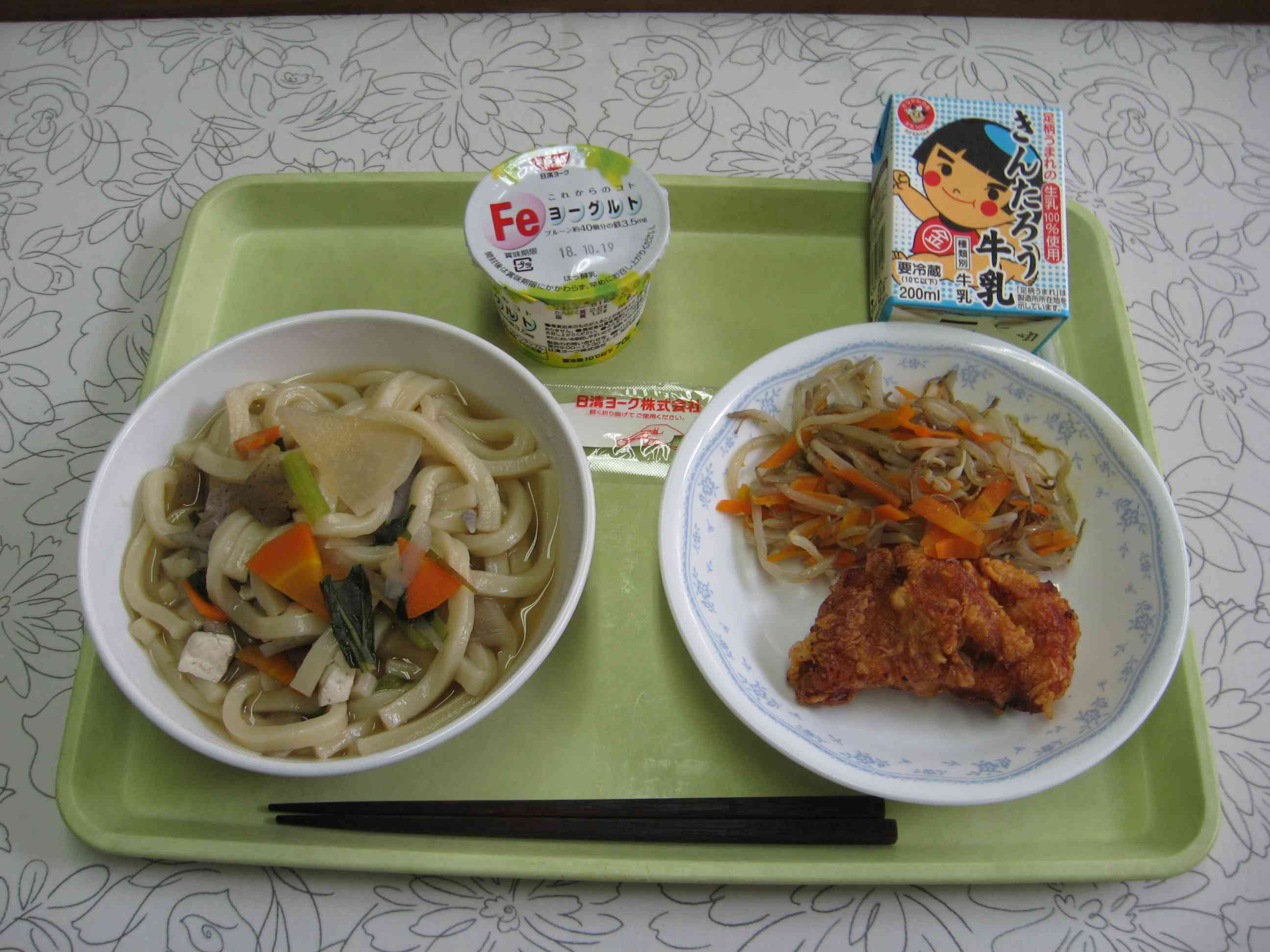 【今日のメニュー】 けんちんうどん、とり天、もやしのピリ辛炒め、Feヨーグルト、牛乳 【栄養教諭から】 今日の天ぷらは「とり天」です。関西では「かしわ天」と呼ばれます。とり天には、鶏のむね肉を使います。にんにくやしょうが、しょう油などの調味料でしっかり下味をつけることで、ぱさぱさせず、ジューシーな天ぷらに仕上がります。