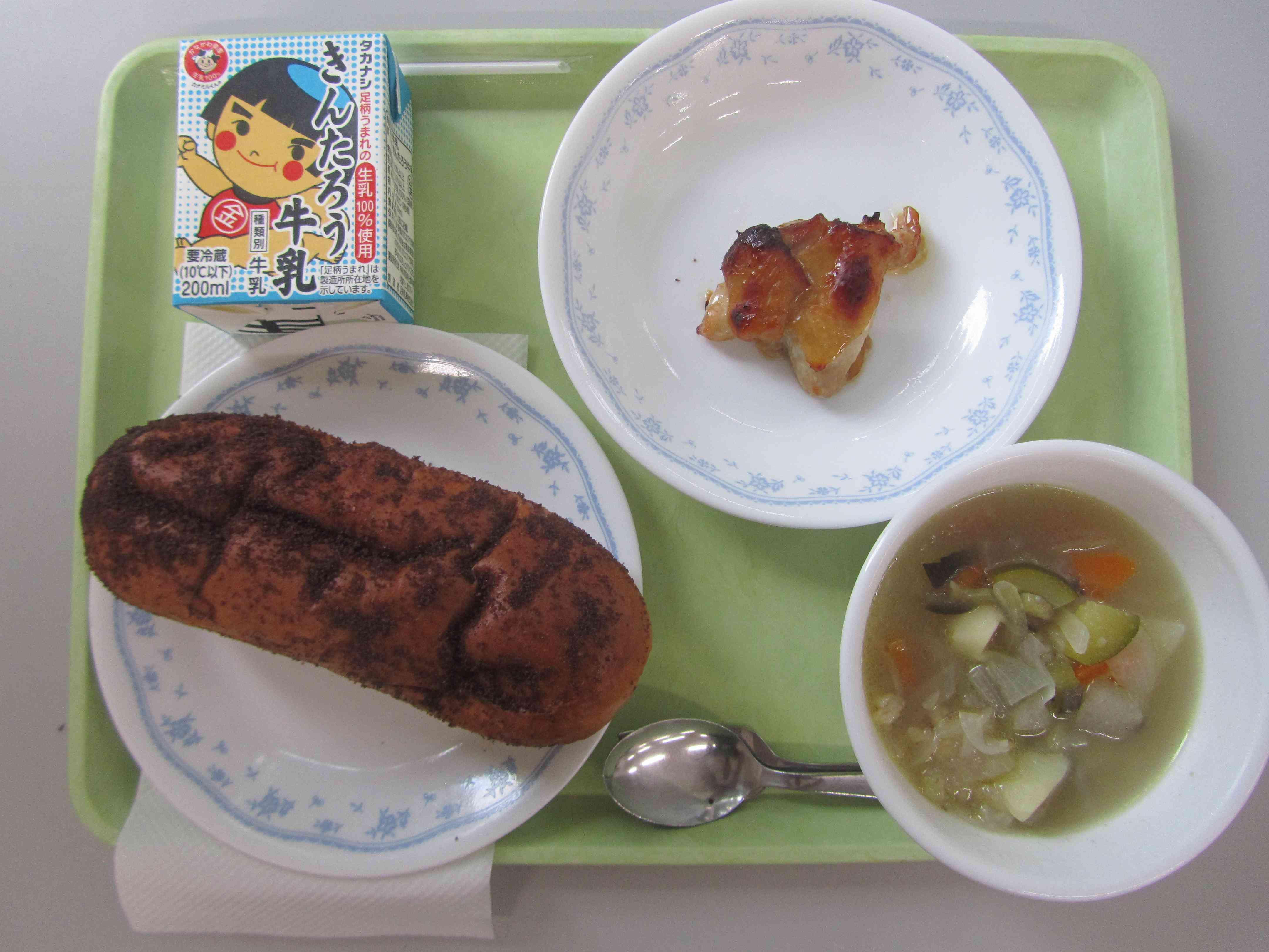 【今日の献立】 ココア揚げパン 牛乳 夏野菜ポトフ 照り焼きチキン まだまだ暑い日が続いているので、夏野菜をたっぷり使ったポトフにしました。ズッキーニ、ナス、冬瓜が入っています。 そして、子供たちに大人気のココア揚げパンも。1年生は「甘いからデザートだ。」と言っておかずを先にモリモリ食べていました。