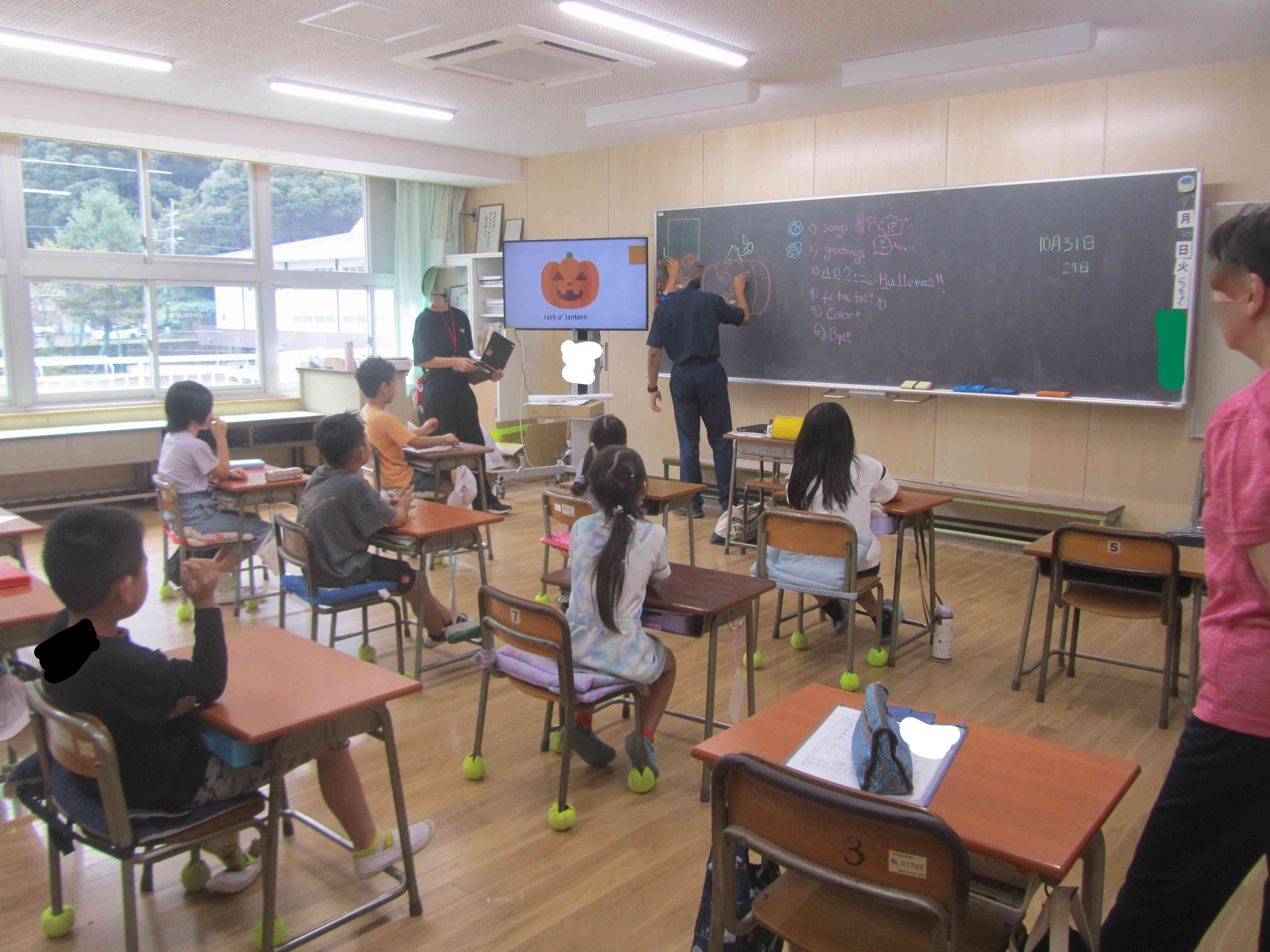 今日は火曜日、English day です。 今週の一言は「Don't worry(心配ないよ)」なので、 チャンスがあったら、使ってみようと思い、2年生の授業を観に行ったら、 How are you ? I'm hungry hungry hungry hungry hungry hungry. You are supper hungry ! Do you like Ramen ?(今日の給食がしょう油ラーメンなので) Yes ! と子供と先生が英語でやりとりをしていました。 2年生なのに、すごいな~と思っていたら… 子供たちと先生が茶目っ気たっぷりの顔をしながら、私に How are you? と聞いてくれました。 リズムに乗りながら I'm fine !と言えるかな…とちょっぴり心配でしたが、なんとか言うことができましたが、ドキドキでした。 2年生はその後、Halloweenに関連する単語を教わったり、色を表現する単語を教わったりしていました。 かぼちゃのランタンをなぜ飾るのか等についても教わり、外国の文化についても勉強していました。【添付ファイル】