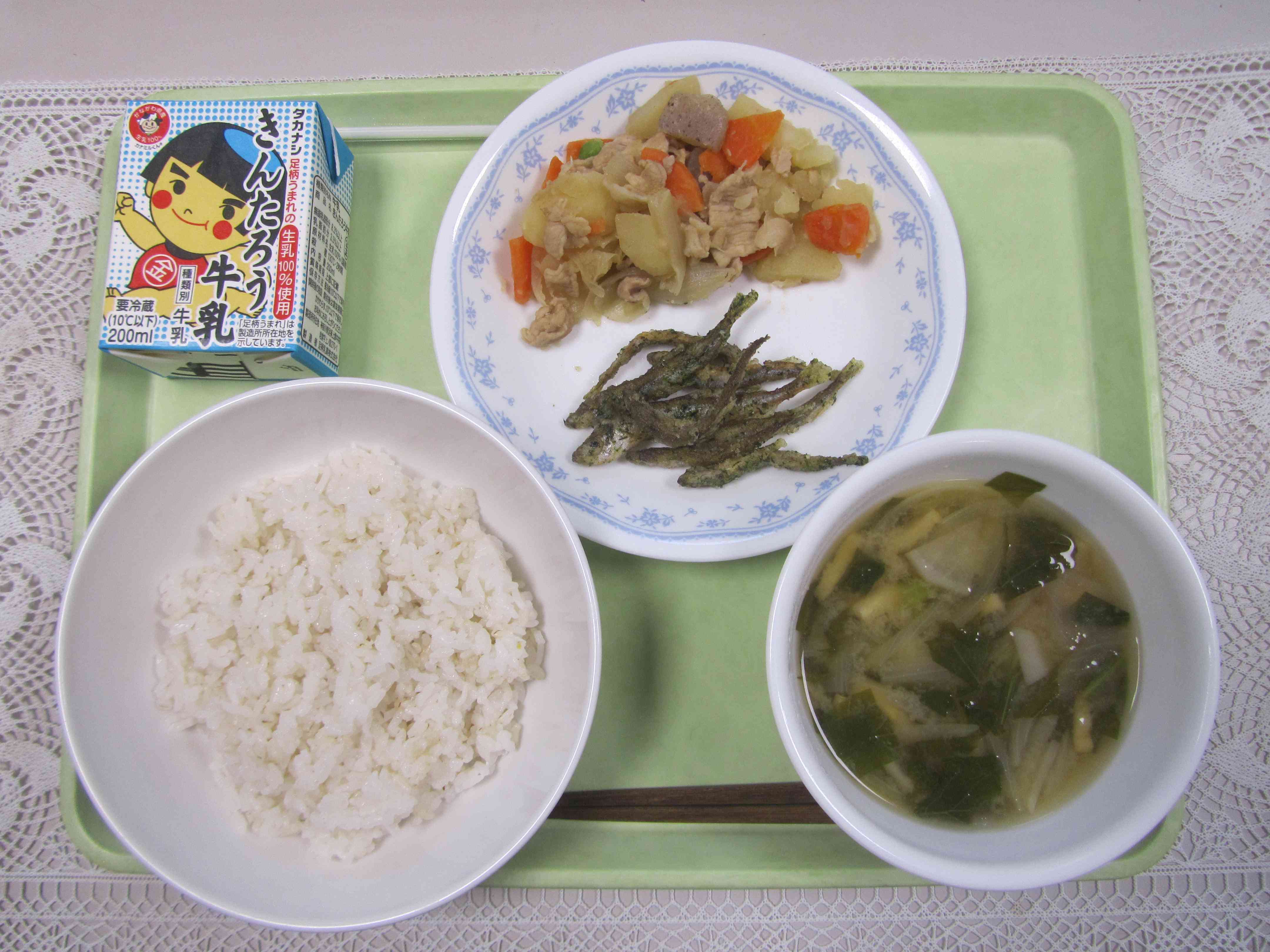 【今日の献立】 麦ごはん 牛乳 かぶのみそ汁 わかさぎののり塩から揚げ 肉じゃが 今日は5年生が校外学習で芦之湖漁業協同組合さんの所に行 ってきて、漁業やわかさぎのことを学んできました。そこで、給食でもわかさぎの献立をやりたいと思いお願いをしたところ、快くわかさぎを提供してくださいました。わかさぎは箱根町の魚で「かながわの名産品100選 」にも選ばれている町 の特産品です。 芦ノ湖のわかさぎは今から100年以上前に霞ヶ浦から卵を移してきたのが始まりです。 今日は給食の終わりごろに、5年生から学んできたことを放送してもらいます。町の味を味わって、そして提供してくださった芦之湖漁協さんに感謝しながら食べてほしいと思います。【添付ファイル】