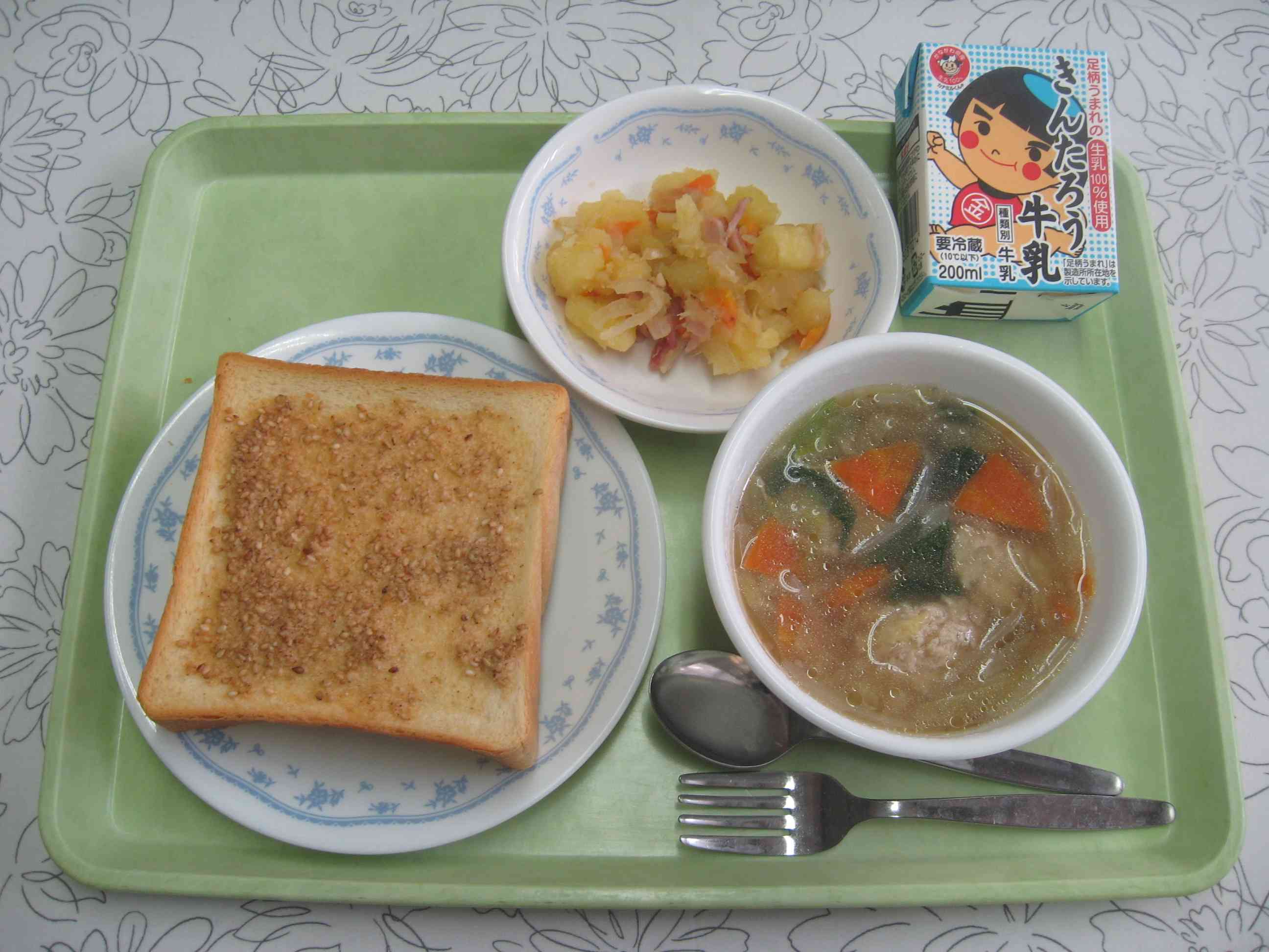 【今日のメニュー】 セサミトースト、肉団子のスープ、ジャーマンポテト、牛乳 【栄養教諭から】 今日は、ごまをたっぷり使ったセサミトーストです。ごまの小さな粒には、栄養がギュッと詰まっていますが、外の皮が固く、粒のままではなかなか吸収されません。すり鉢ですこしすることで、栄養を残さずとることができます。 また、今日はスープに肉団子を入れました。玉ねぎを入れた手作りです。