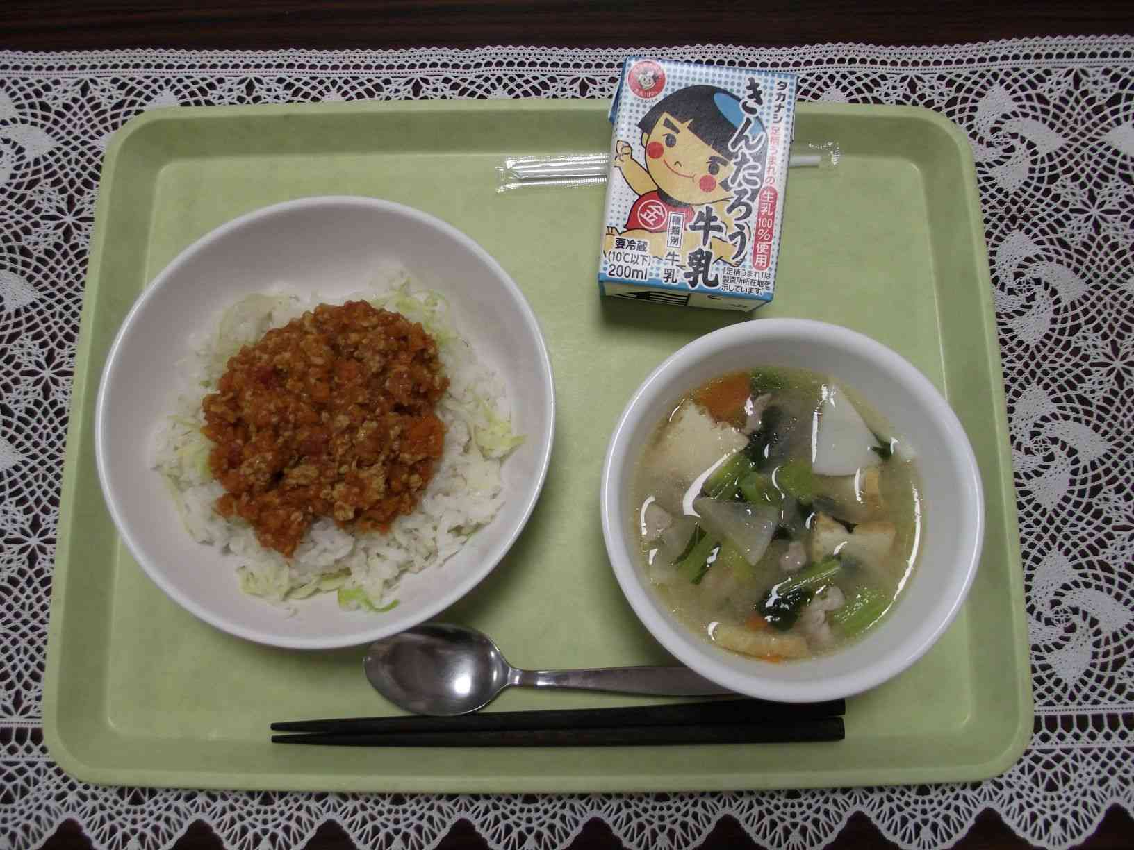 【献立】 タコライス 牛乳 イナムドゥチ 今日の献立は沖縄フェアです。タコライスは全国的にも有名なご当地グルメですね。ごはんの上にタコスミートと野菜をのせたボリューミーな一品。給食ではレタスやトマトの代わりに、茹でキャベツを使用しました。教室での配缶のしやすさを考慮してご飯の上にキャベツをのせて配缶しました。 イナムドゥチは沖縄県のおみそ汁で、豚の三枚肉とカステラかまぼこが入る郷土料理です。給食ではカステラかまぼこの代わりに、かまぼこをいれました。豚肉の甘みがおいしい、白みそ仕立てのおつゆです。【添付ファイル】