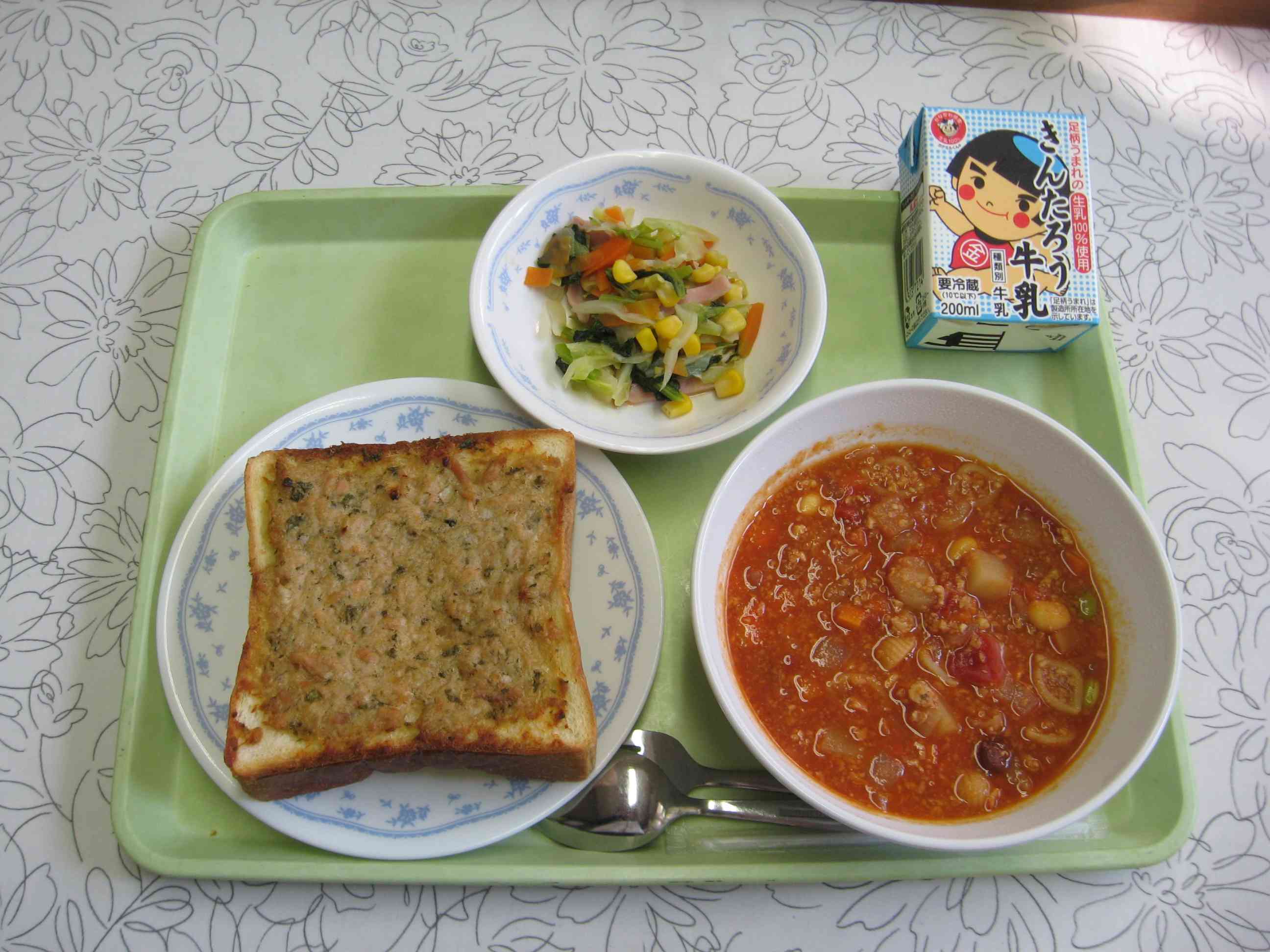 【今日のメニュー】 ツナトースト、チリコンカン、いろどりソテー、牛乳 【栄養教諭から】 今日は、アメリカの国民食「チリコンカン」です。ひき肉と豆をトマト味で煮込みます。 本校では、ここでも高野豆腐をボリュームアップ食材として使用しています。量が増えるだけでなく、良質なたんぱく質とカルシウムもたくさんとれます。高野豆腐は、もどして細かく刻んで入れると、ひき肉にそっくりな仕上がりになるので、ぜひご家庭でも試してみてはいかがでしょうか。【添付ファイル】