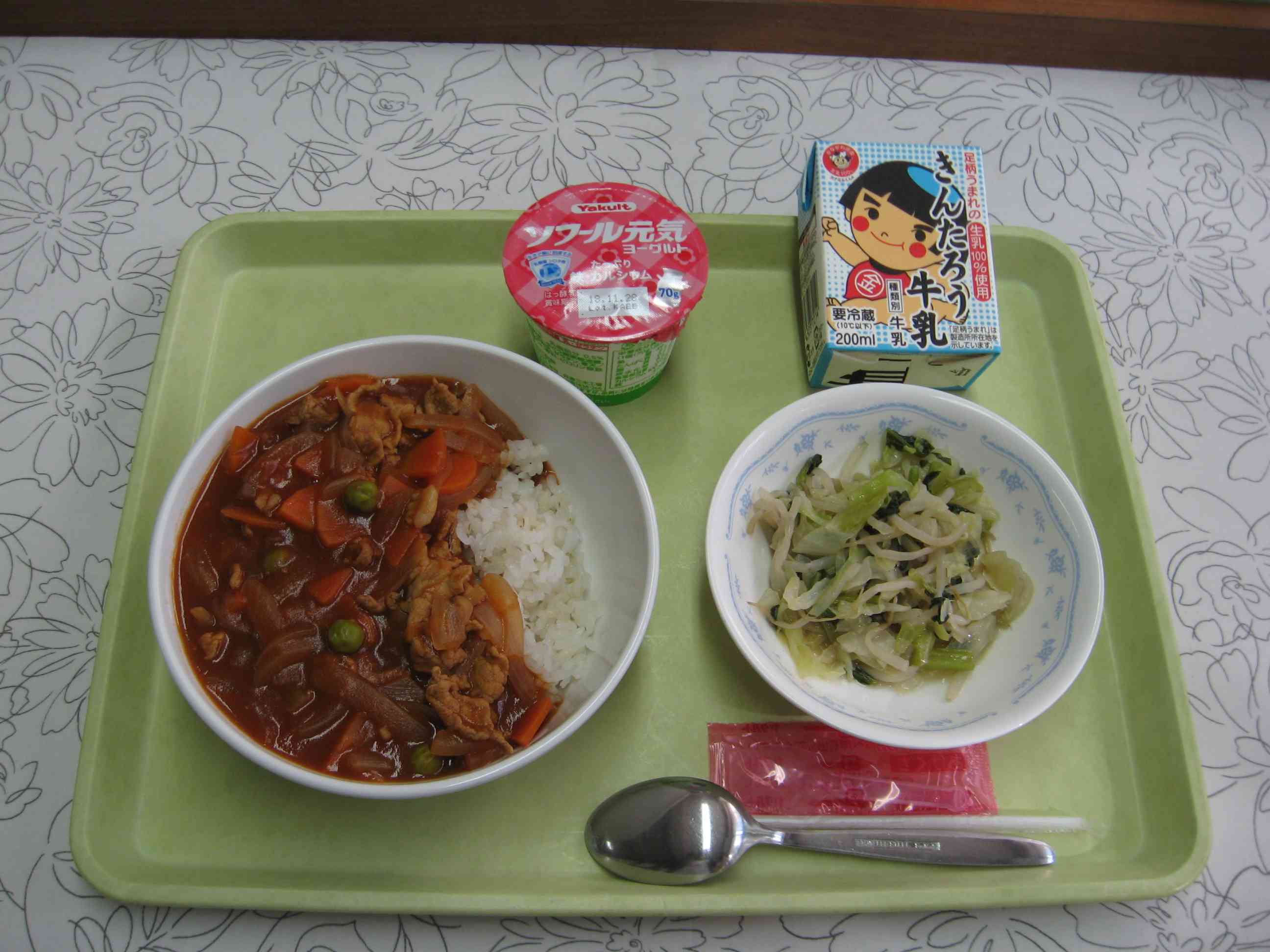 【今日のメニュー】 ハヤシライス、キャベツと青菜の炒め物、元気ヨーグルト、牛乳 【栄養教諭から】 今日は、子どもたちの大好きなハヤシライスです。たっぷりのタマネギをじっくり炒め、甘みを出しました。元気ヨーグルトで、鉄分とカルシウムが強化されています。