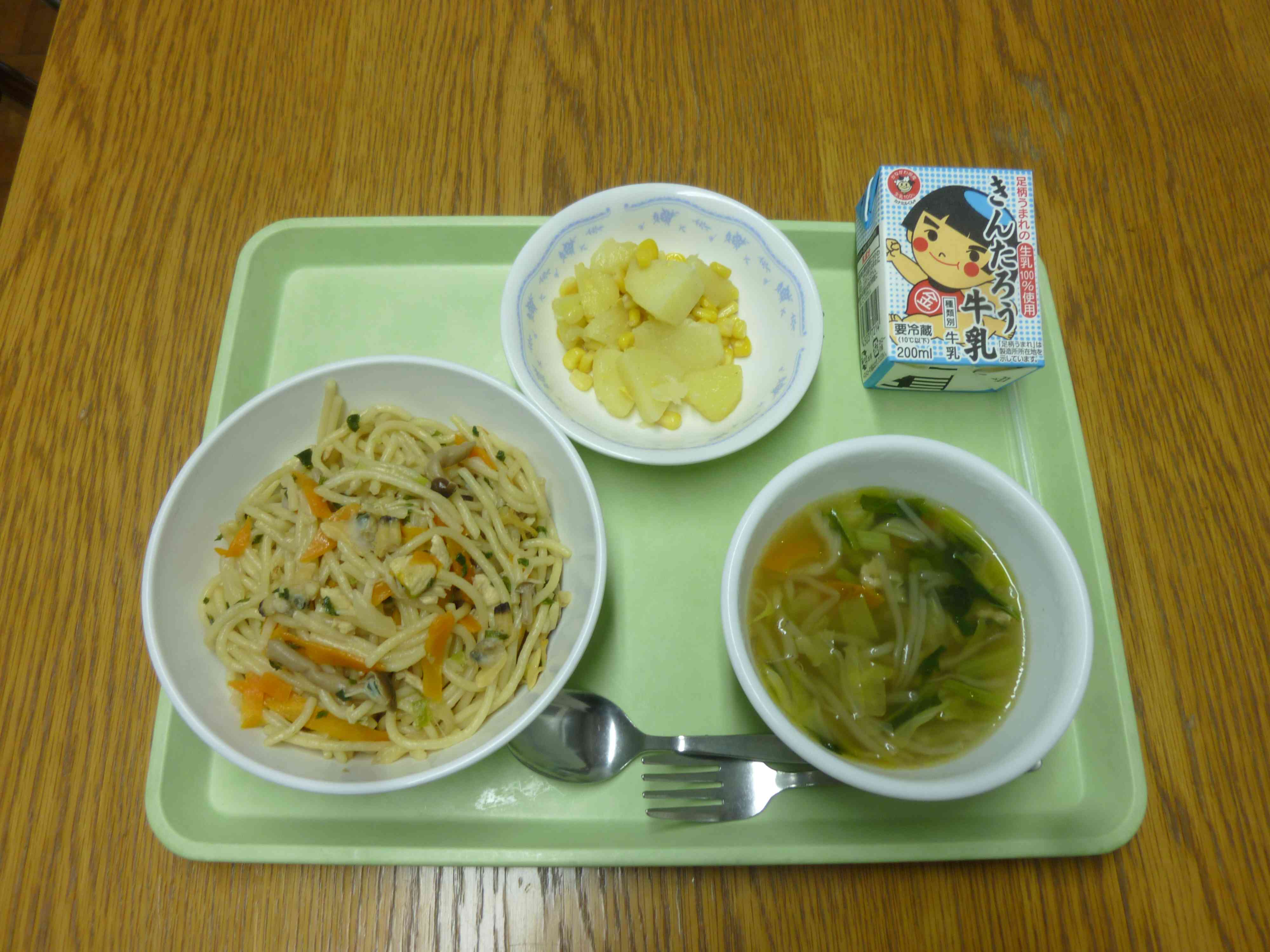 【今日のメニュー】 和風スパゲティ、コンソメスープ、コーンポテト、牛乳 【栄養教諭から】 今日は、あさり入りの和風スパゲティです。子どもたちは、少し苦手なあさりですが、きのこや人参など様々な具も入れて、バター醤油味に仕上げました。栄養たっぷりのあさりですので、残さず食べてほしいです。