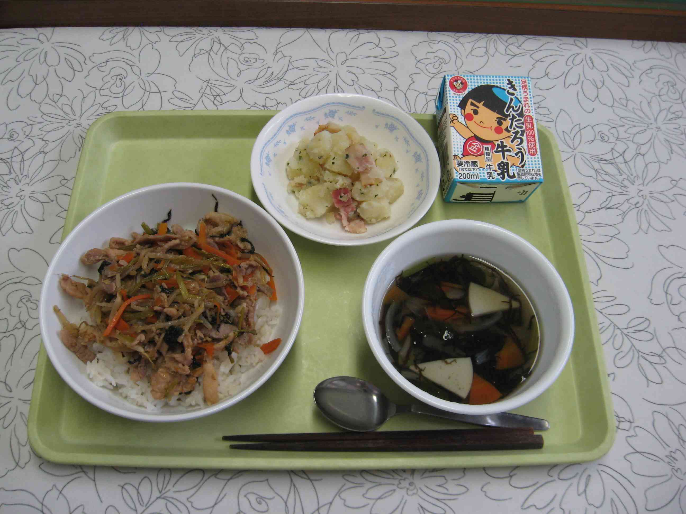 【今日のメニュー】 ビビンバ丼、もずくスープ、ジャガイモの香り炒め、牛乳 【栄養教諭から】 今日はビビンバです。味付けには、韓国料理らしくコチジャンとさわやかな甘味を出すためにリンゴをすりおろして使いました。お肉と一緒に野菜もたくさん食べられる献立です。 ジャガイモの香り炒めには、香りの野菜パセリを使いました。かざりや彩りで使われるパセリですが、ビタミンCが豊富です。ぜひ食べてほしいです。